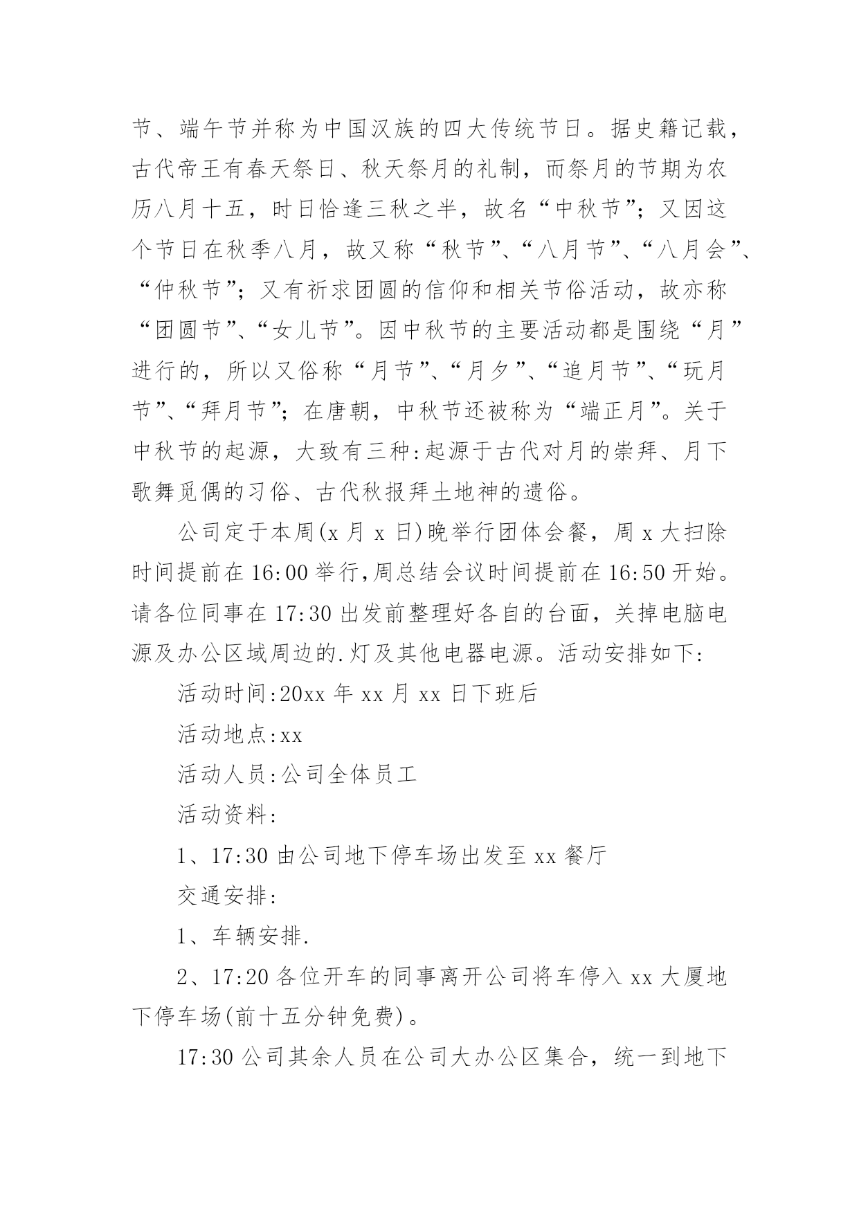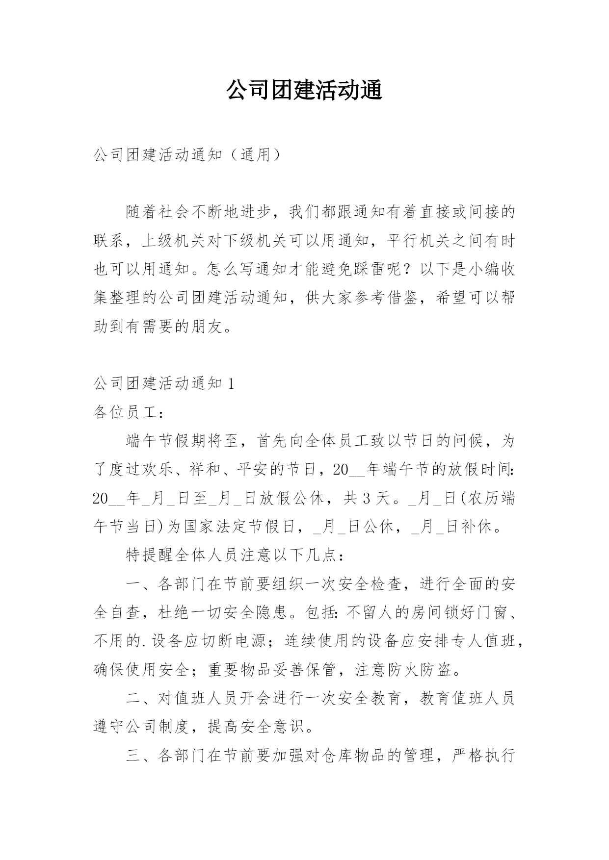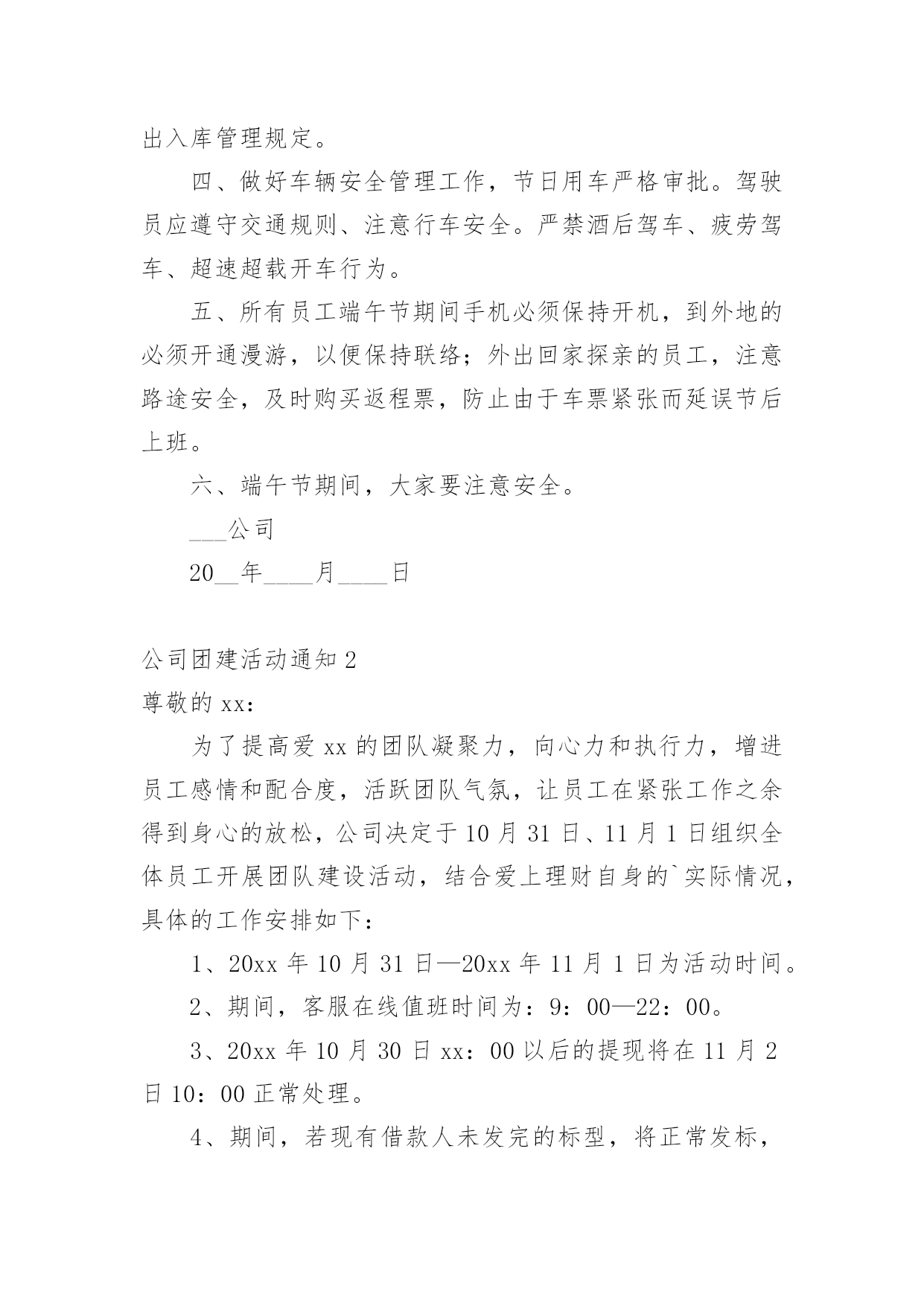 公司团建活动通公司团建活动通知(通用)随着社会不断地进步,我们都跟通知有着直接或间接的联系,上级机关对下级机关可以用通知,平行机关之间有时也可以用通知。怎么写通知才能避免踩雷呢?以下是小编收集整理的公司团建活动通知,供大家参考借鉴,希望可以帮助到有需要的朋友。公司团建活动通知1各位员工:端午节假期将至,首先向全体员工致以节日的问候,为了度过欢乐、祥和、平安的节日,20__年端午节的放假时间:20__年_月_日至_月_日放假公休,共3天。_月_日(农历端午节当日)为国家法定节假日,_月_日公休,_月_日补休