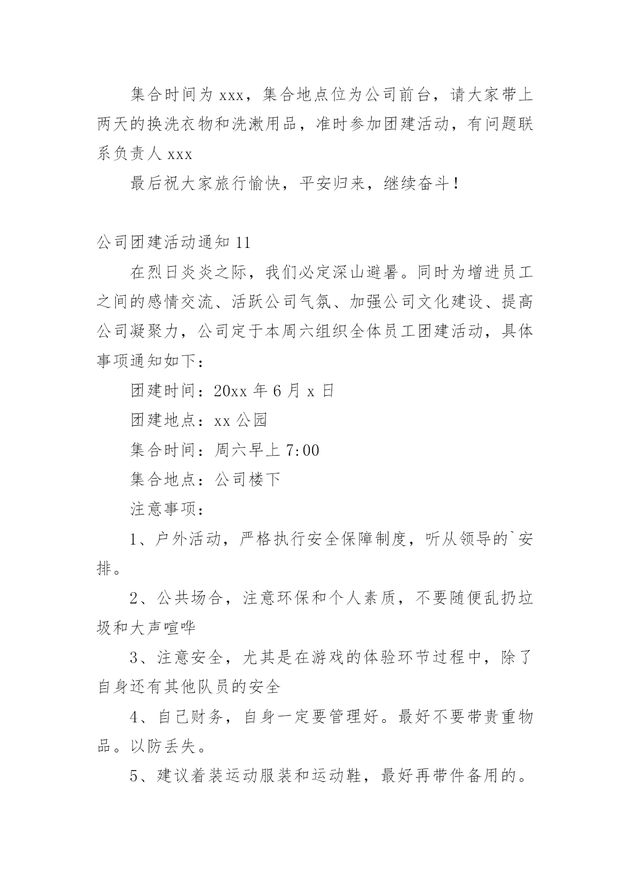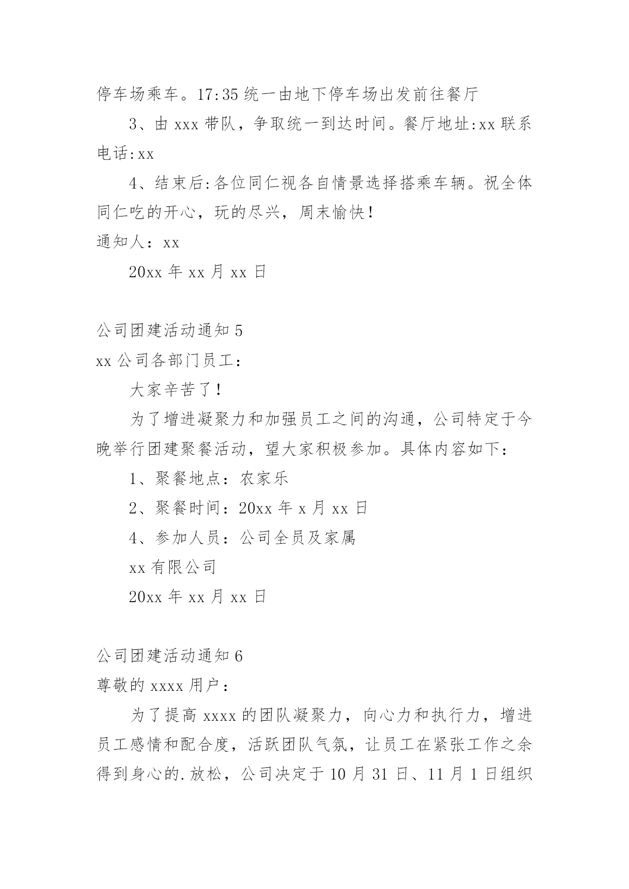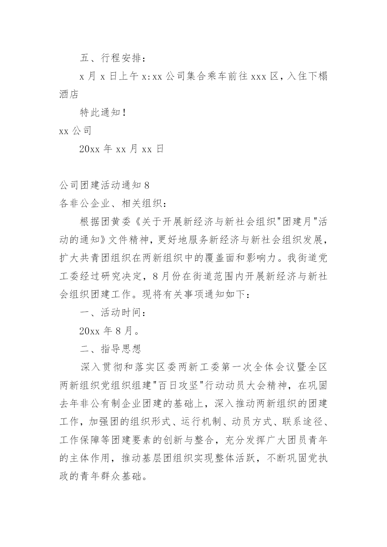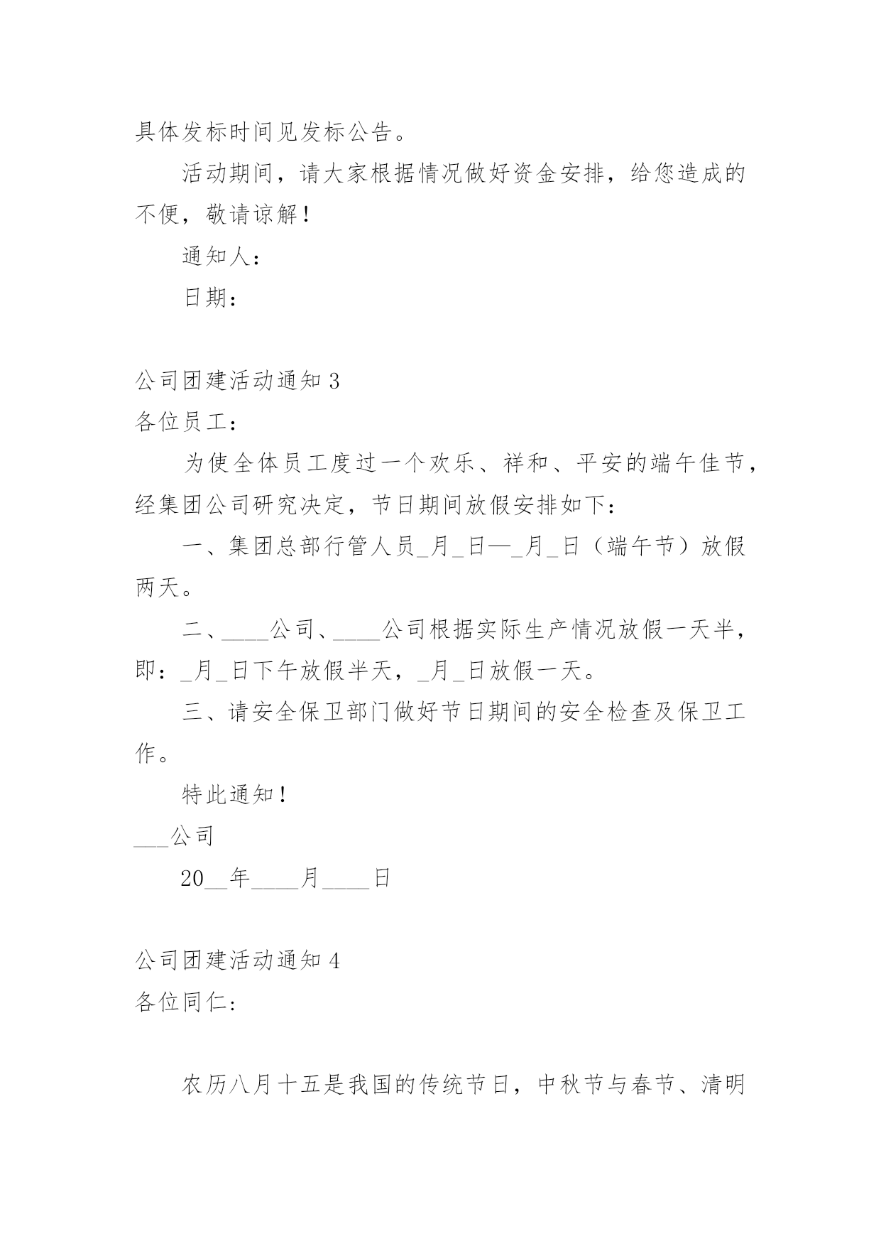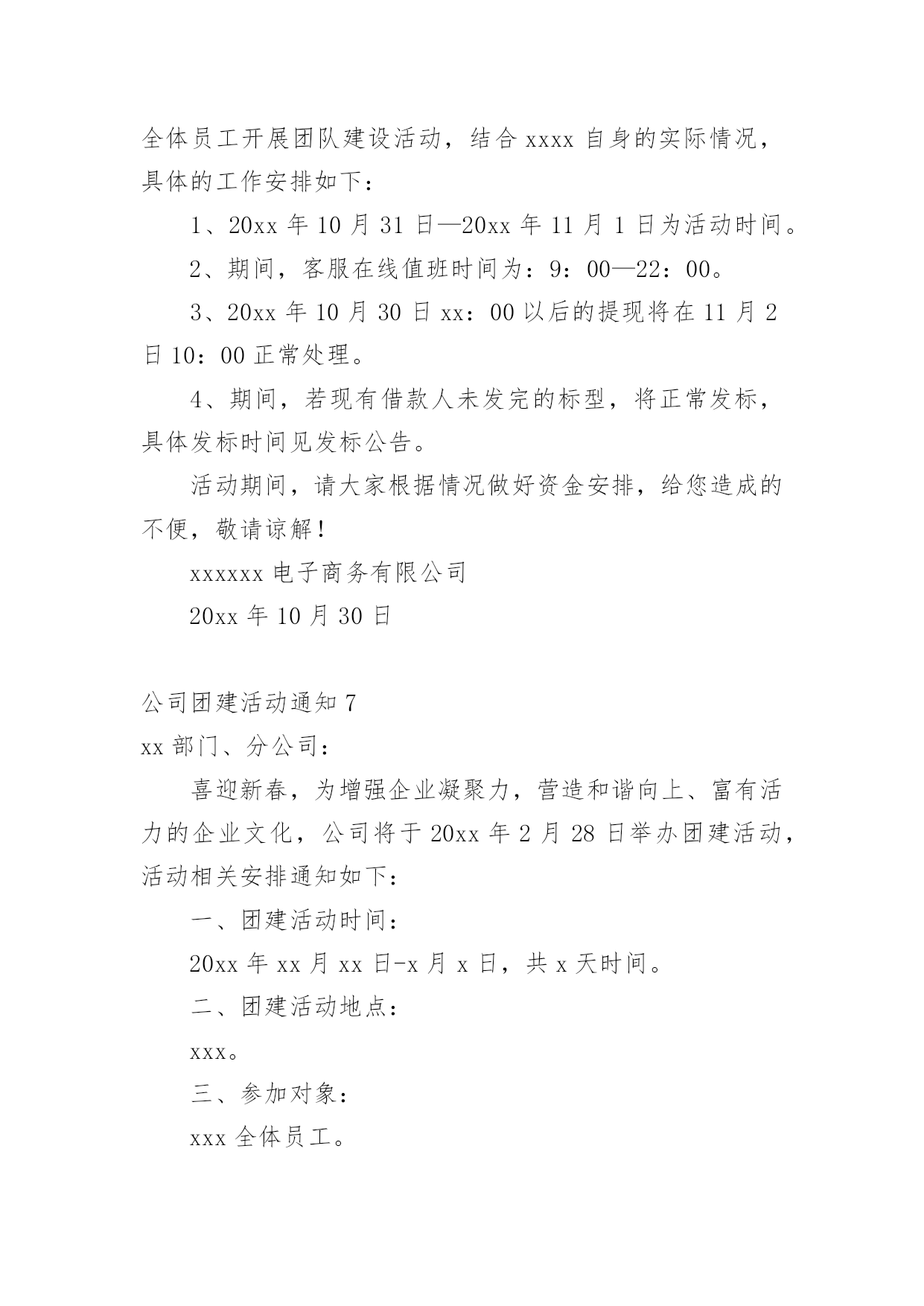 团建活动通[精选]团建活动通知在不断进步的社会中,能够利用到通知的场合越来越多,通知根据根据适用范围的不同可划分为不同种类。你写通知时总是无从下笔?以下是小编整理的团建活动通知,欢迎阅读与收藏。团建活动通知1为加强公司团队凝聚力、丰富员工文化生活,公司决定组织全体员工集体赴xx参加户外团建活动,时间定于20xx年xx月xx日(周六)至20xx年xx月xx日(周一),期间公司不能正常办公,若有问题可与对接人微信留言,xx月xx日正常上班处理相应事务,特此通知。给您带来不便,深感歉意,望您理解。xx20xx年