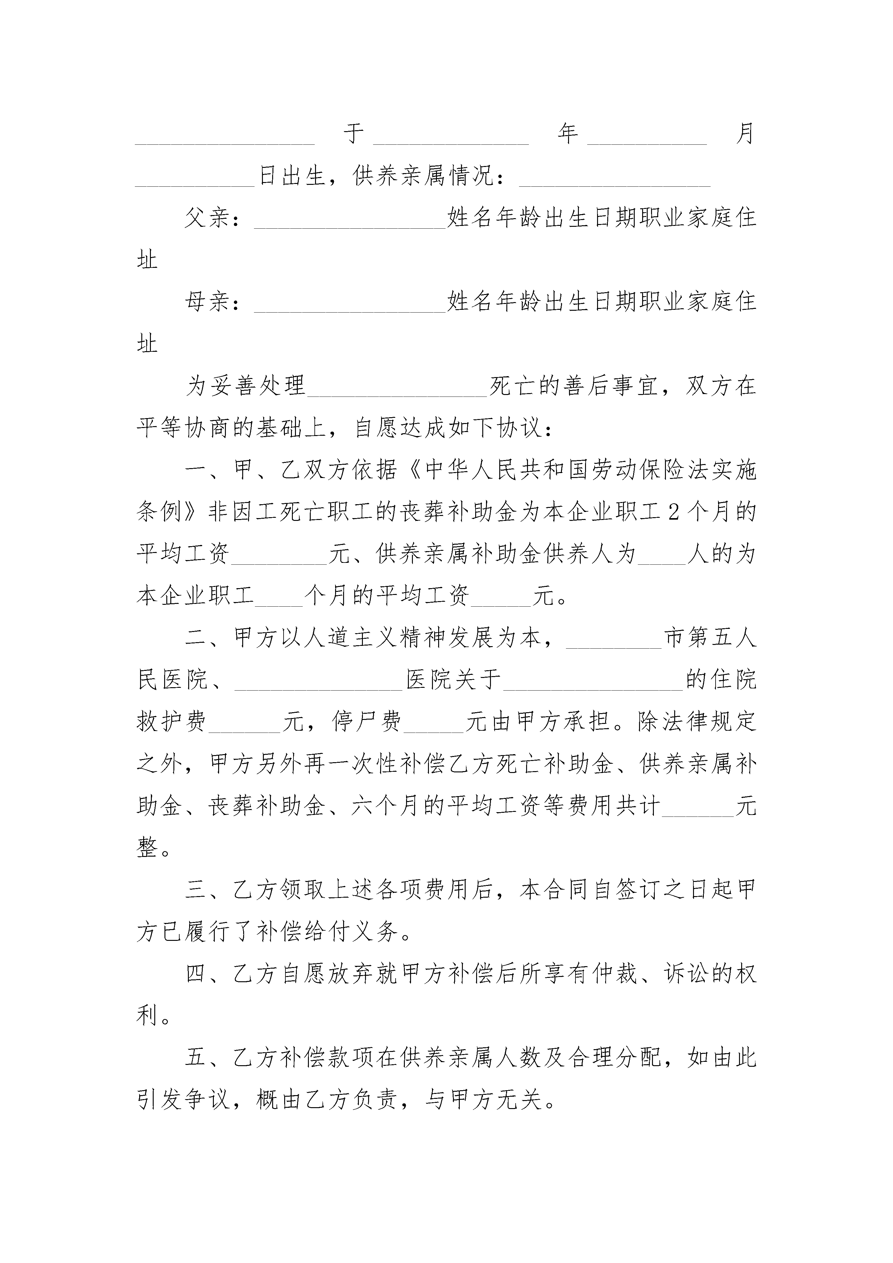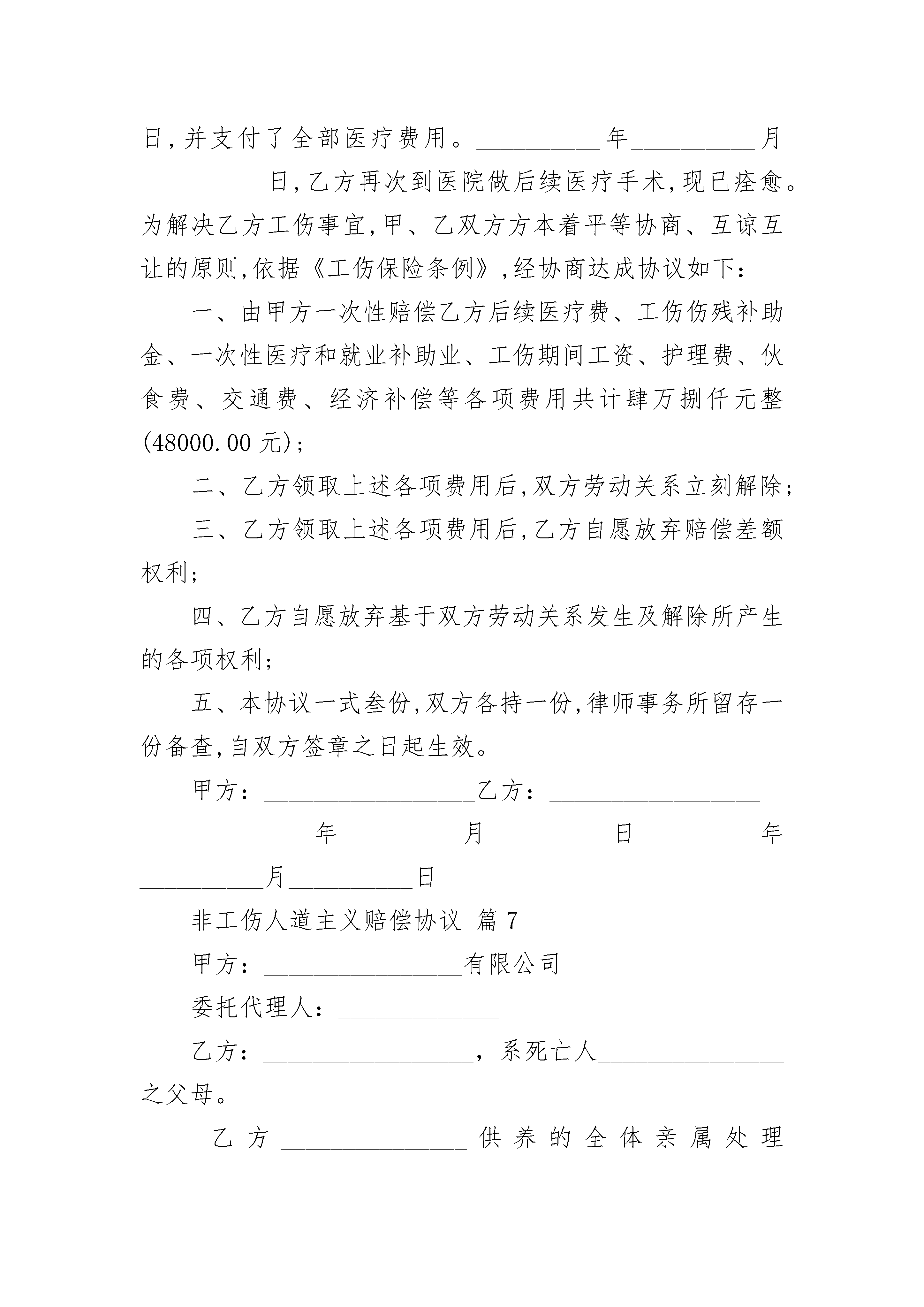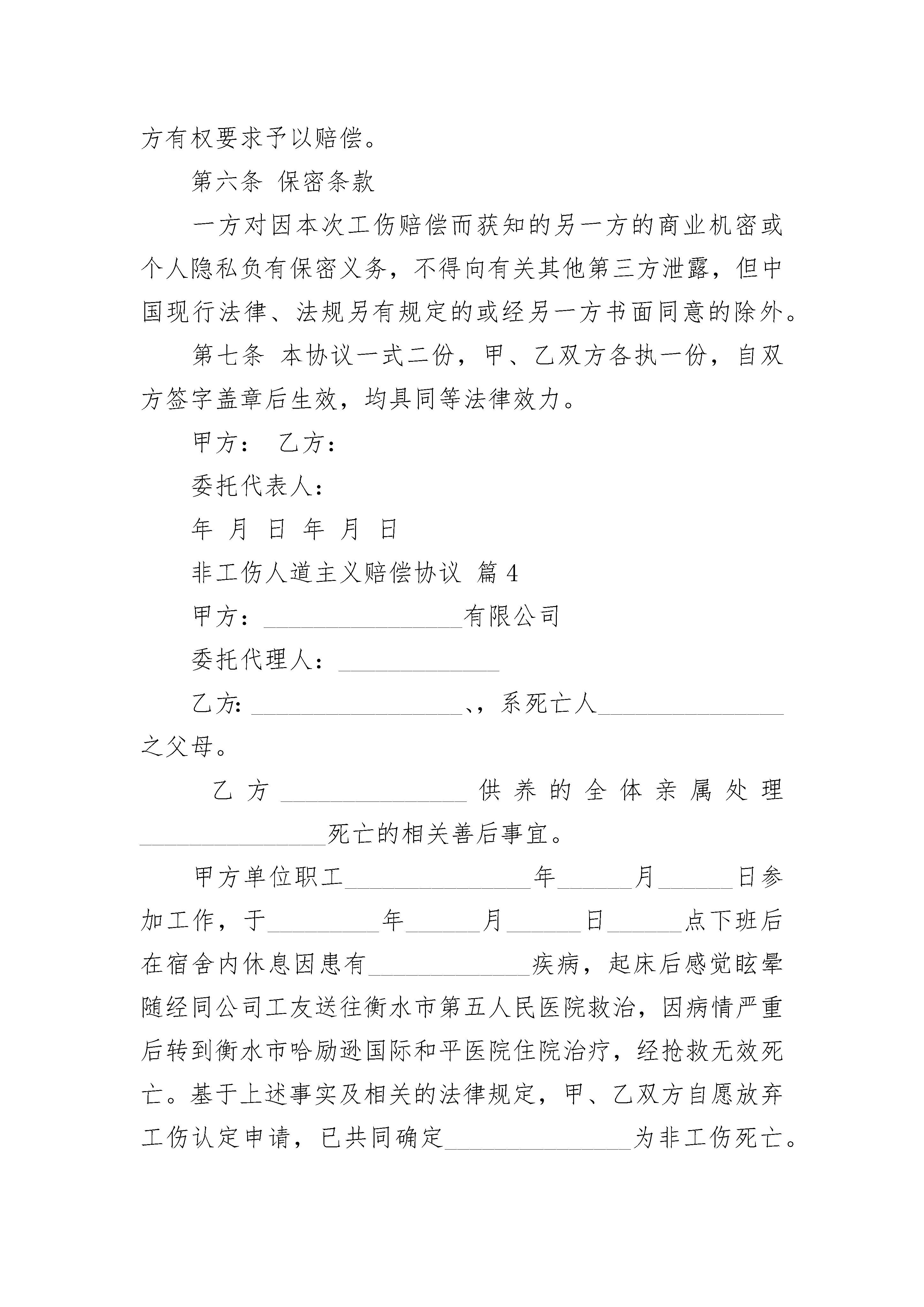 非工伤人道主义赔偿协议非工伤人道主义赔偿协议(通用21篇)非工伤人道主义赔偿协议篇1甲方:_________________乙方:_________________的配偶。农民工_______系______________混凝土工,于_____年_____月_____日,女,身份证号:_________________系死者月21日私自在______________宾馆住宿(未在租赁的个人宿舍住宿),_____年_____月_____日晚点由于,非因工死亡死亡;甲乙双方本着平等、协商一致的原则,就一事