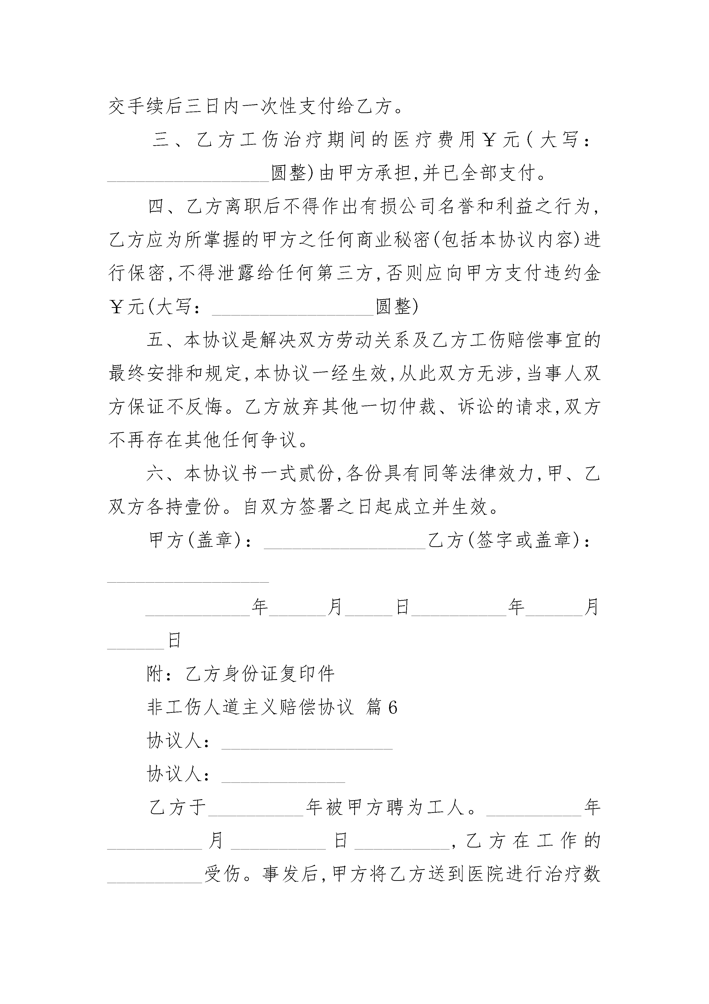 工伤人道主义赔偿协议工伤人道主义赔偿协议现如今,我们都跟协议有着直接或间接的联系,签订协议是解决纠纷的保障。那么协议的格式,你掌握了吗以下是小编收集整理的工伤人道主义赔偿协议,欢迎大家借鉴与参考,希望对大家有所帮助。工伤人道主义赔偿协议1甲方(用人单位):___________乙方(工人):___________,男,岁,身份证号:___________乙方于年月日在施工工地施工时不慎发生伤害事故,左手腕骨骨裂。事后,甲方立即将乙方送往医院抢治,经治疗后复查,现无大碍,为妥善解决乙方受伤事宜,甲乙双方本着