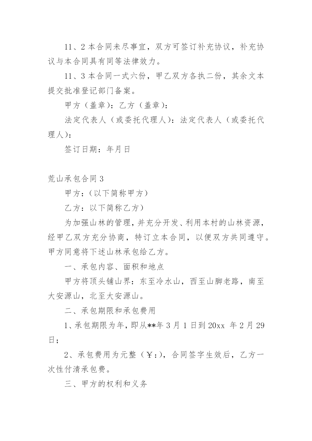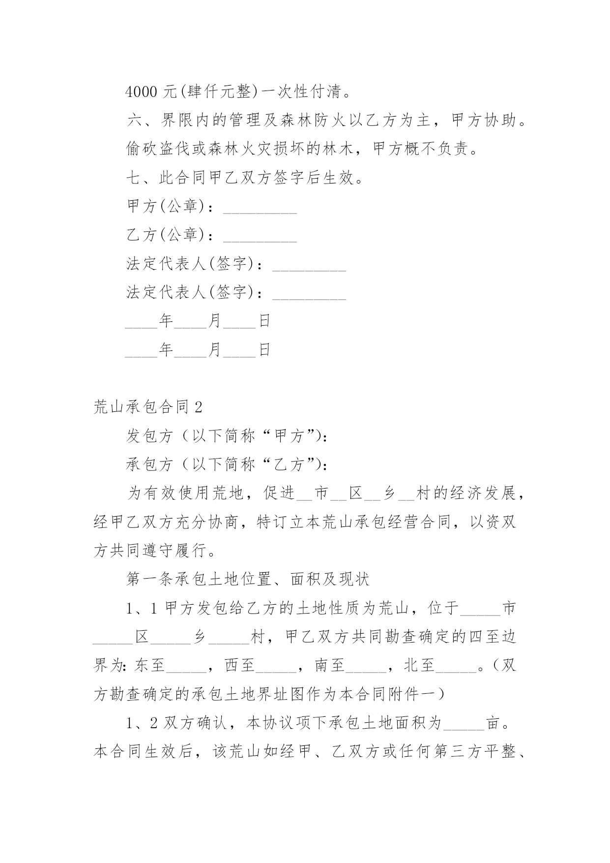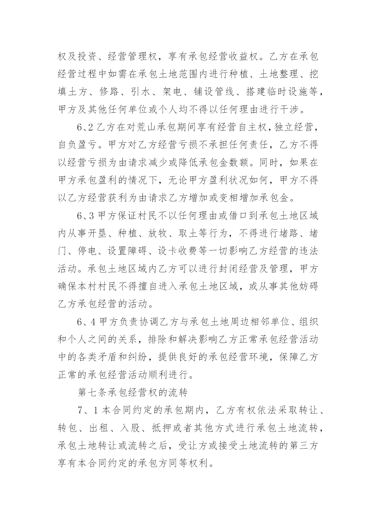 荒山承包合同荒山承包合同范本【推荐】在人们的法律意识不断增强的社会,合同的地位越来越不容忽视,合同的签订是对双方之间权利义务的最好规范。合同有不同的类型,当然也有不同的目的,以下是小编整理的荒山承包合同范本,供大家参考借鉴,希望可以帮助到有需要的朋友。荒山承包合同范本1甲方(发包方):乙方(承包方):为开发利用土地资源,发展良种按短周期工业原料林,经甲、乙双方平等协商,达成以下合同。第一条:甲方将座落在马虎岭的荒山,发包给乙方经营,四界是:东至湿幼;南至尾幼;西至弄马;北至松王。此林地面积由甲乙双方用广西