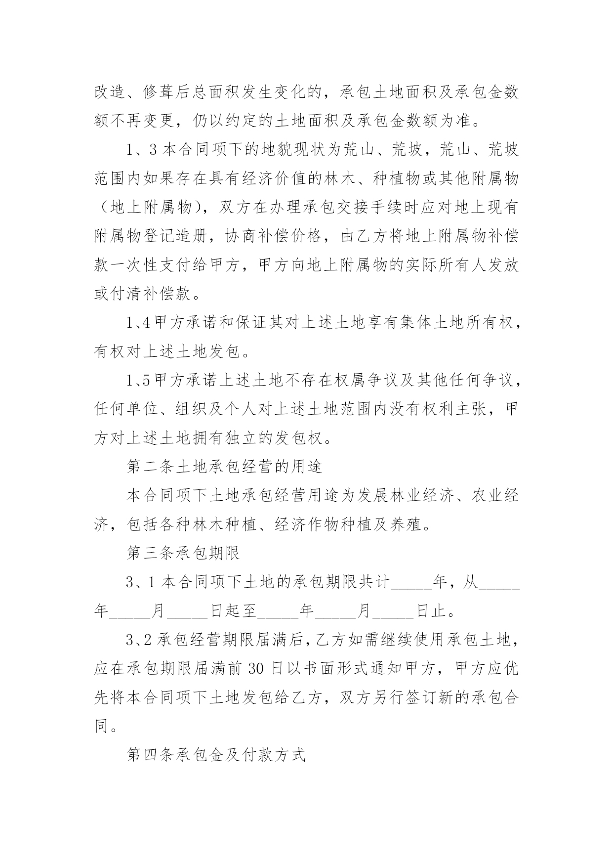 荒山承包合同荒山承包合同[热门]随着法律知识的普及,我们用到合同的地方越来越多,签订合同也是避免争端的最好方式之一。那么合同书的格式,你掌握了吗?下面是小编为大家收集的荒山承包合同,欢迎大家分享。荒山承包合同1甲方:________乙方:________为了绿化荒山,防止水土流失,在自身无法自筹资金造林的情况下,经过村民小组多次开会研究,在小新________和小新街村委的监督下,公开的将左卫屯村荒山承包给乙方造林使用。经甲乙双方____年____月____日共同协商,达成以下协议:一、甲方将______