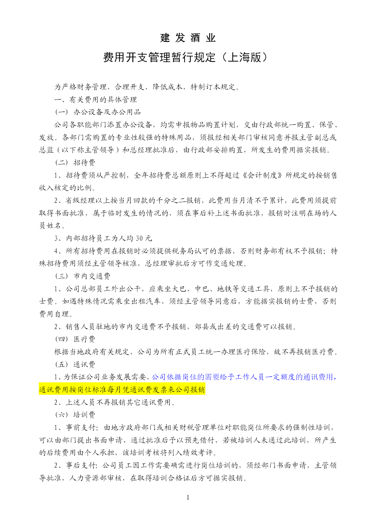 建发酒业费用开支管理暂行规定(上海版)为严格财务管理,合理开支,降低成本,特制订本规定。一、有关费用的具体管理(一)办公设备及办公用品公司各职能部门添置办公设备,均需申报物品购置计划,交由行政部统一购置、保管、发放。各部门需购置的专业性较强的特殊用品,须报经相关部门审核同意并报主管副总或总监(以下称主管领导)和总经理批准后,由行政部安排购置,所发生的费用据实报销。(二)招待费1、招待费须从严控制,全年招待费总额原则上不得超过《会计制度》所规定的按销售收入核定的比例。2、省级经理以上按当月回款的千分之二报销