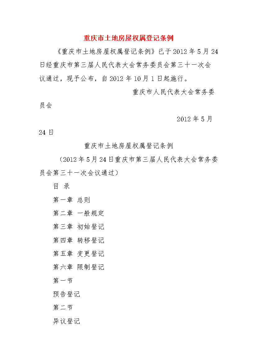 编号:时间:2021年x月x日书山有路勤为径,学海无涯苦作舟页码:第页共NUMPAGES29页第PAGE\*MERGEFORMAT29页共NUMPAGES\*MERGEFORMAT29页重庆市土地房屋权属登记条例《重庆市土地房屋权属登记条例》已于2012年5月24日经重庆市第三届人民代表大会常务委员会第三十一次会议通过,现予公布,自2012年10月1日起施行。重庆市人民代表大会常务委员会2012年5月24日重庆市土地房屋权属登记条例(2012年5月24日重庆市第三届人民