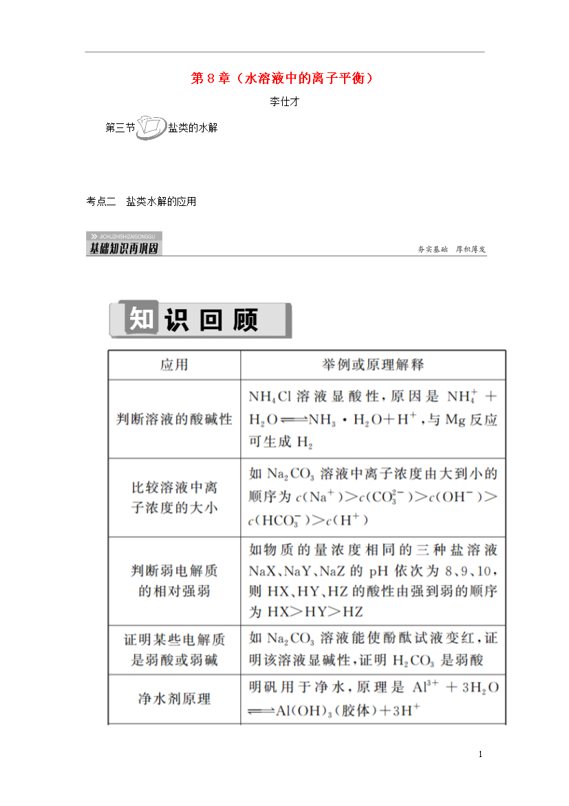 第8章(水溶液中的离子平衡)李仕才eq\o(\s\up17(第三节),\s\do15())eq\o(\s\up17(盐类的水解),\s\do15())考点二盐类水解的应用1.下面提到的问题中,与盐的水解有关的是()①明矾和FeCl3可作净水剂②为保存FeCl3溶液,要在溶液中加少量盐酸③实验室配制AlCl3溶液时,应先把它溶在盐酸中,而后加水稀释④NH4Cl与ZnCl2溶液可作焊接中的除锈剂⑤实验室盛放Na2CO3、Na2SiO3等溶液的试剂瓶应用橡皮塞,而不能用