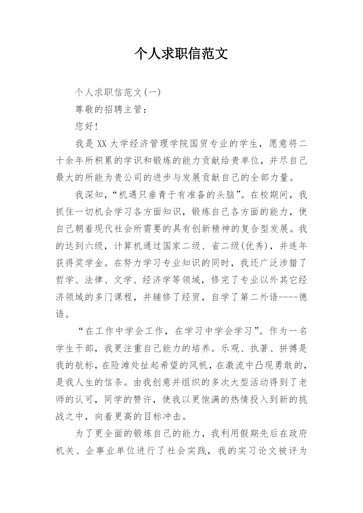 个人求职信范文个人求职信范文(一)尊敬的招聘主管:您好!我是XX大学经济管理学院国贸专业的学生,愿意将二十余年所积累的学识和锻炼的能力贡献给贵单位,并尽自己最大的所能为贵公司的进步与发展贡献自己的全部力量。我深知,“机遇只垂青于有准备的头脑”。在校期间,我抓住一切机会学习各方面知识,锻炼自己各方面的能力,使自己朝着现代社会所需要的具有创新精神的复合型发展。我的达到六级,计算机通过国家二级、省二级(优秀),并连年获得奖学金。在努力学习专业知识的同时,我还广泛涉猎了哲学、法律、文学、经济学等领域,修完了专业以