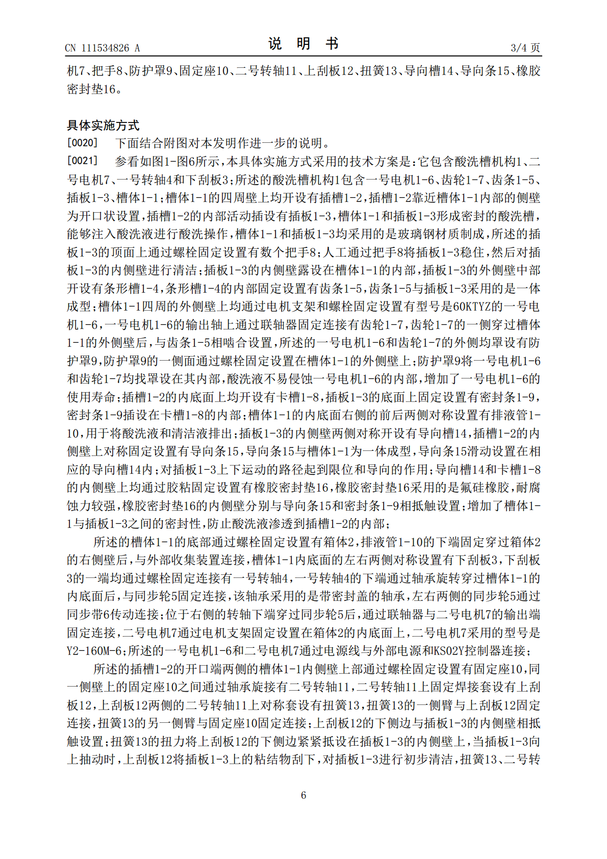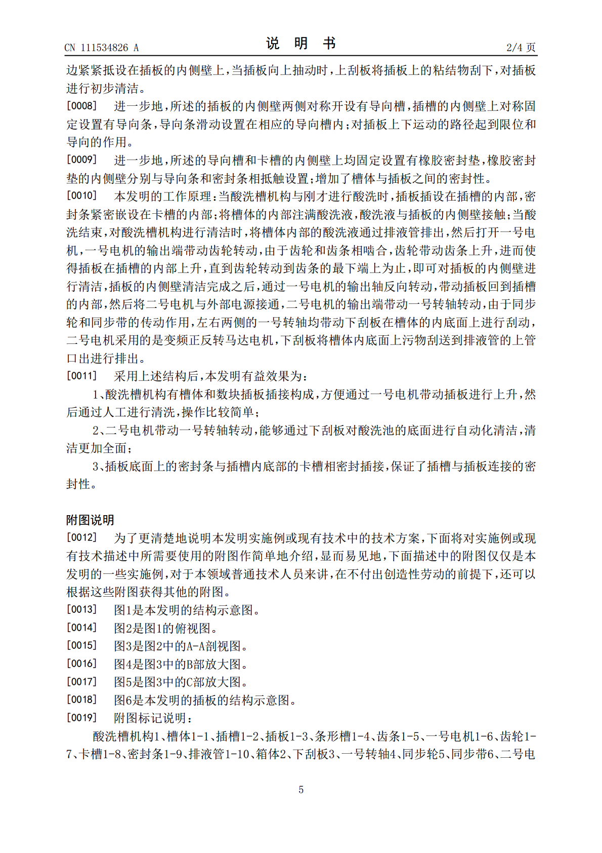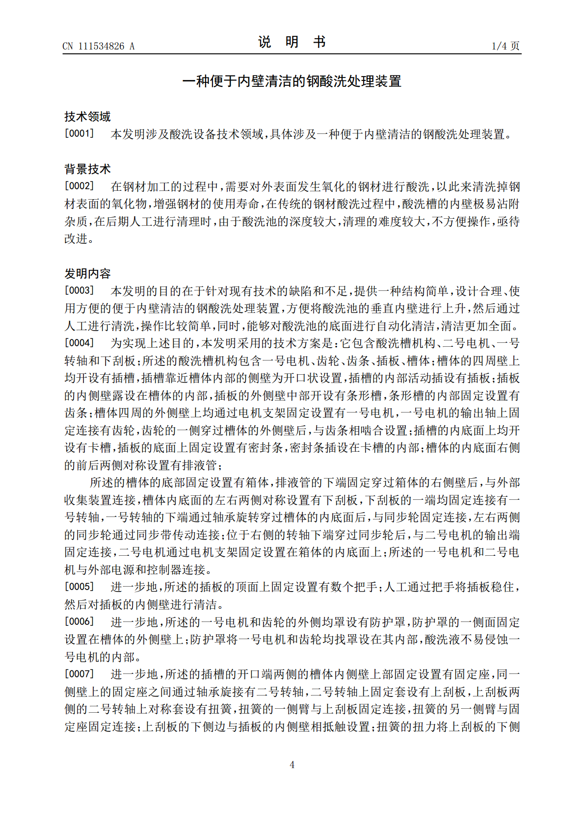 一种便于内壁清洁的钢酸洗处理装置,本发明涉及酸洗设备技术领域,槽体的四周壁上均开设有插槽,插槽靠近槽体内部的侧壁为开口状设置,插槽的内部活动插设有插板;插板的内侧壁露设在槽体的内部,插板的外侧壁中部开设有条形槽,条形槽的内部固定设置有齿条;槽体四周的外侧壁上均通过电机支架固定设置有一号电机,一号电机的输出轴上固定连接有齿轮,齿轮的一侧穿过槽体的外侧壁后,与齿条相啮合设置;插槽的内底面上均开设有卡槽,插板的底面上固定设置有密封条,密封条插设在卡槽的内部,方便将酸洗池的垂直内壁进行上升,然后通过人工进行清洗,
