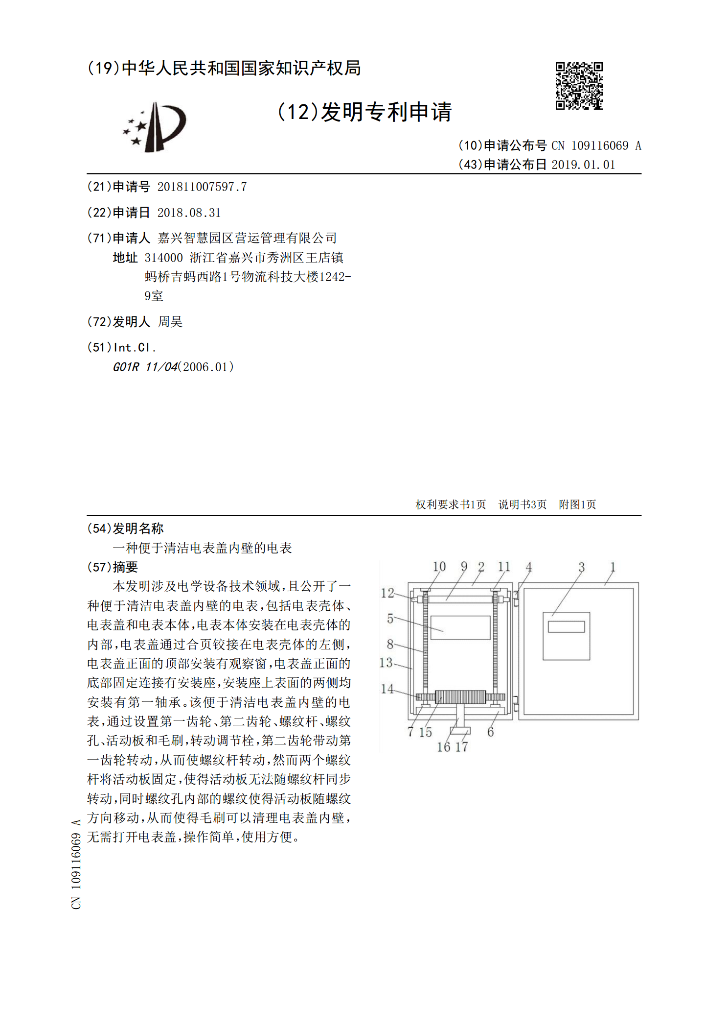 本发明涉及电学设备技术领域,且公开了一种便于清洁电表盖内壁的电表,包括电表壳体、电表盖和电表本体,电表本体安装在电表壳体的内部,电表盖通过合页铰接在电表壳体的左侧,电表盖正面的顶部安装有观察窗,电表盖正面的底部固定连接有安装座,安装座上表面的两侧均安装有第一轴承。该便于清洁电表盖内壁的电表,通过设置第一齿轮、第二齿轮、螺纹杆、螺纹孔、活动板和毛刷,转动调节栓,第二齿轮带动第一齿轮转动,从而使螺纹杆转动,然而两个螺纹杆将活动板固定,使得活动板无法随螺纹杆同步转动,同时螺纹孔内部的螺纹使得活动板随螺纹方向移动