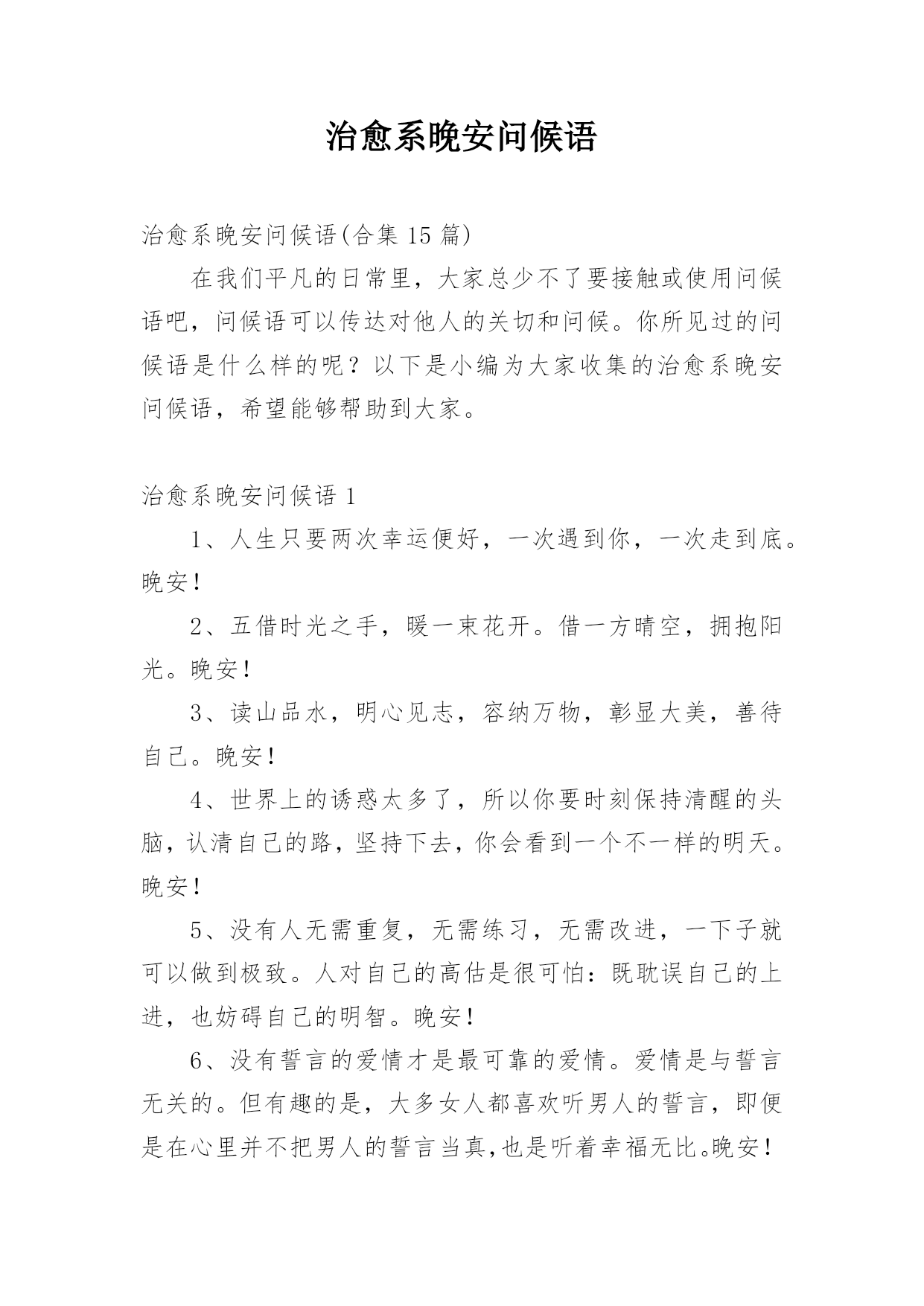 治愈系晚安问候语治愈系晚安问候语(合集15篇)在我们平凡的日常里,大家总少不了要接触或使用问候语吧,问候语可以传达对他人的关切和问候。你所见过的问候语是什么样的呢?以下是小编为大家收集的治愈系晚安问候语,希望能够帮助到大家。治愈系晚安问候语11、人生只要两次幸运便好,一次遇到你,一次走到底。晚安!2、五借时光之手,暖一束花开。借一方晴空,拥抱阳光。晚安!3、读山品水,明心见志,容纳万物,彰显大美,善待自己。晚安!4、世界上的诱惑太多了,所以你要时刻保持清醒的头脑,认清自己的路,坚持下去,你会看到一个不一样