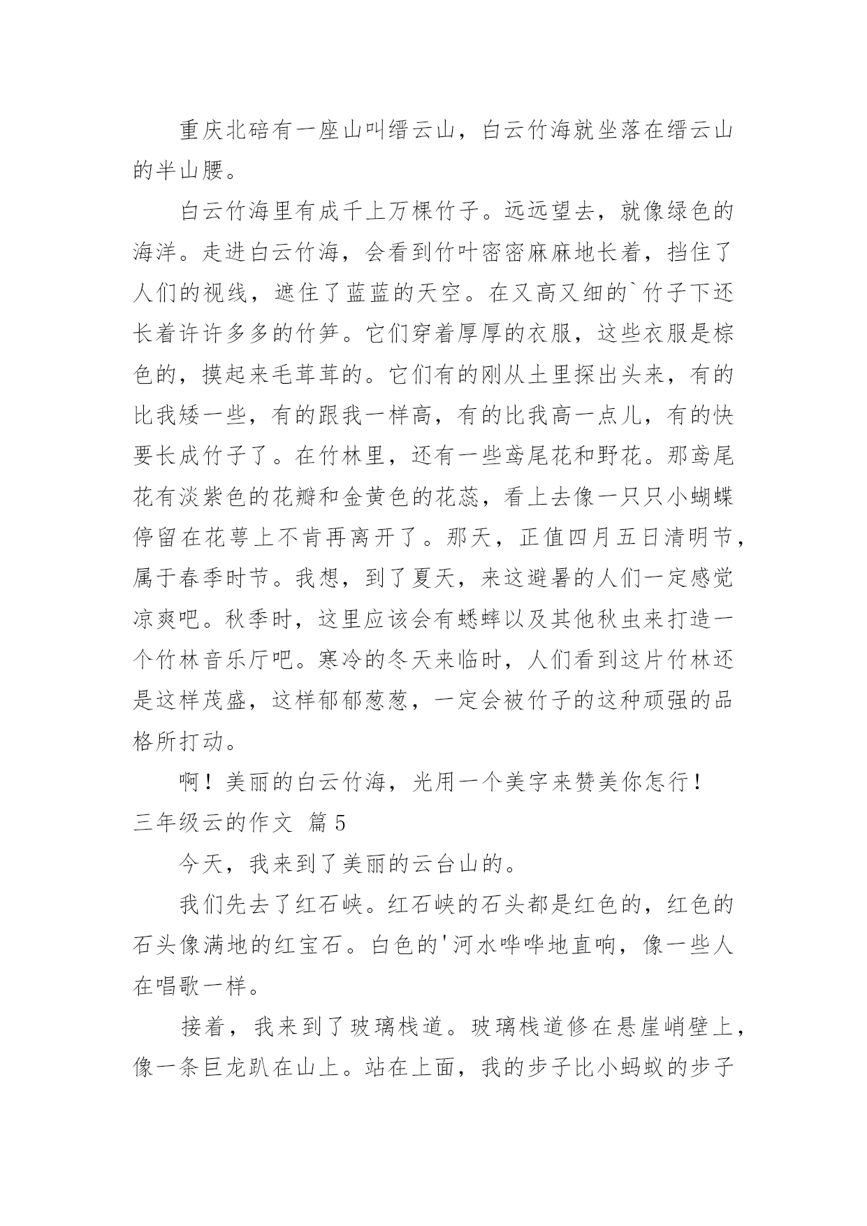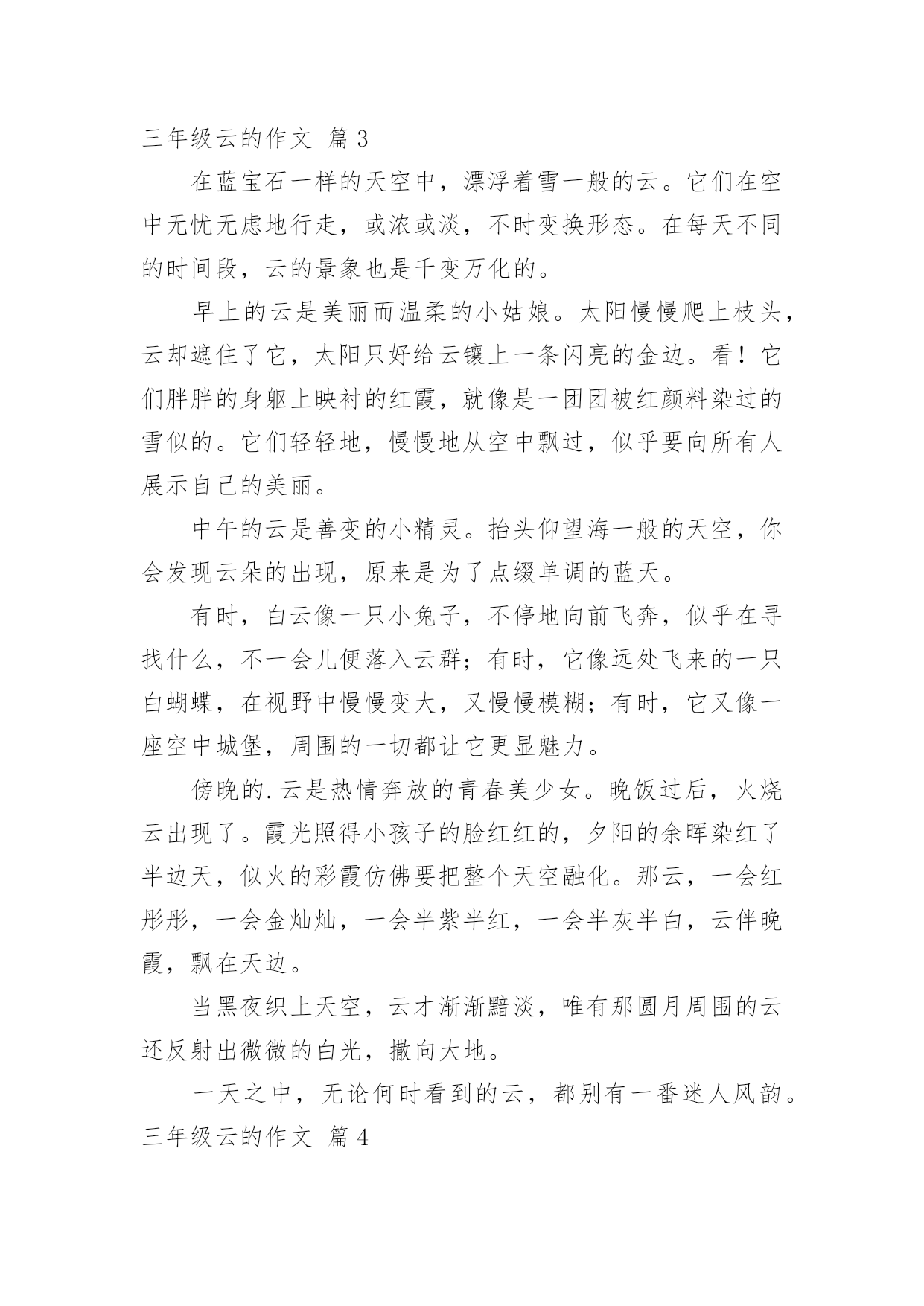 云三年级作文实用的云三年级作文锦集九篇在生活、工作和学习中,大家都尝试过写作文吧,作文可分为小学作文、中学作文、大学作文(论文)。相信许多人会觉得作文很难写吧,下面是小编为大家整理的云三年级作文9篇,欢迎大家借鉴与参考,希望对大家有所帮助。云三年级作文篇1我是一朵白云,飘浮在天空。有一天,我突然有了一个美妙的想法,想到处去旅行,去结交新的朋友,去欣赏更美丽的风景。首先,我来到公园里,公园里有花有草,有树有鸟,游客们有的在划船,有的在乘坐观光车在游览风景,还有的正在和小动物们拍照留影!他们看到我,都说:呀,