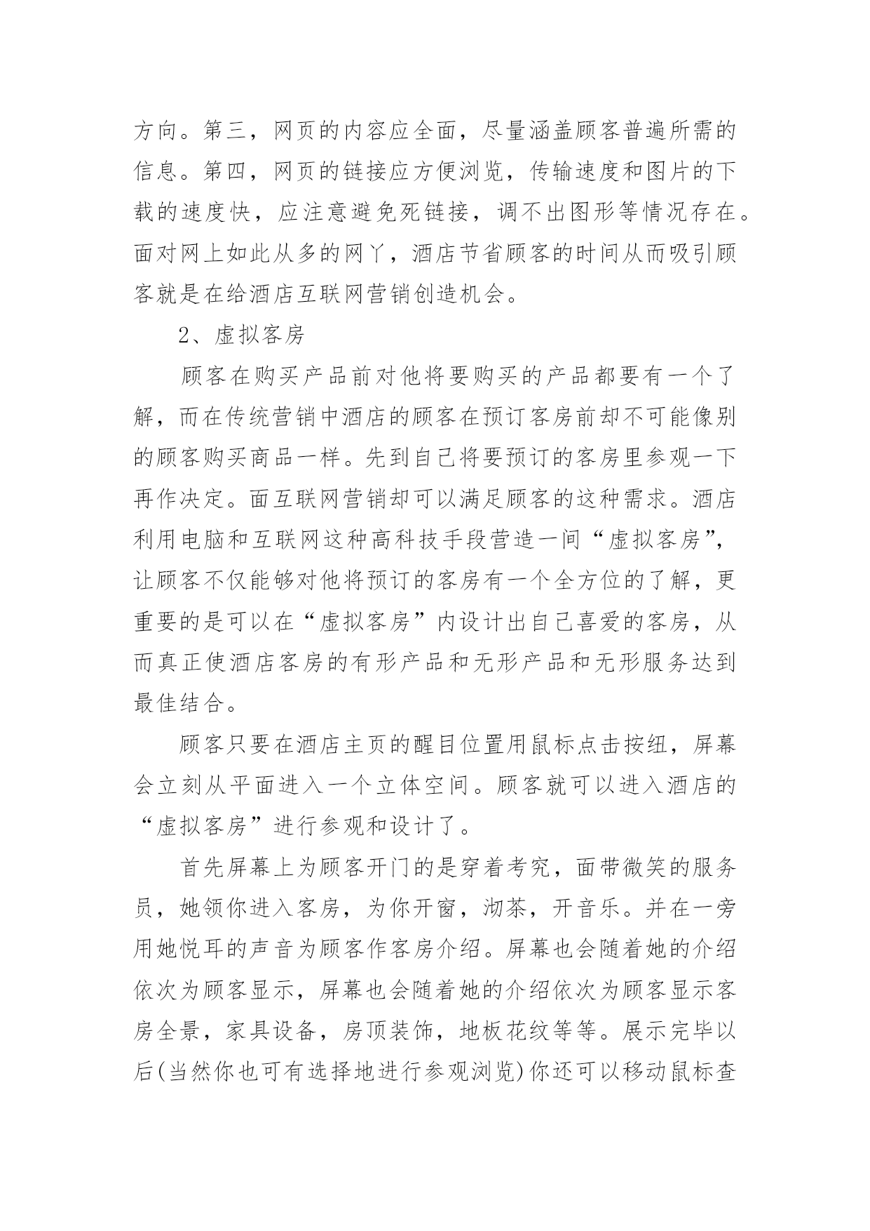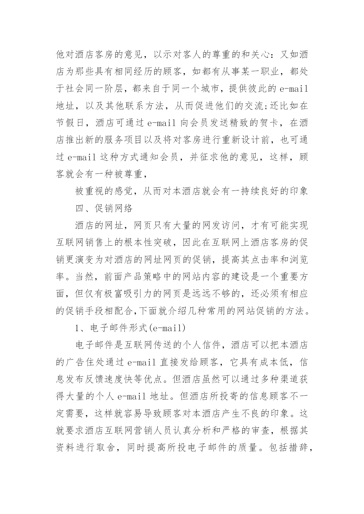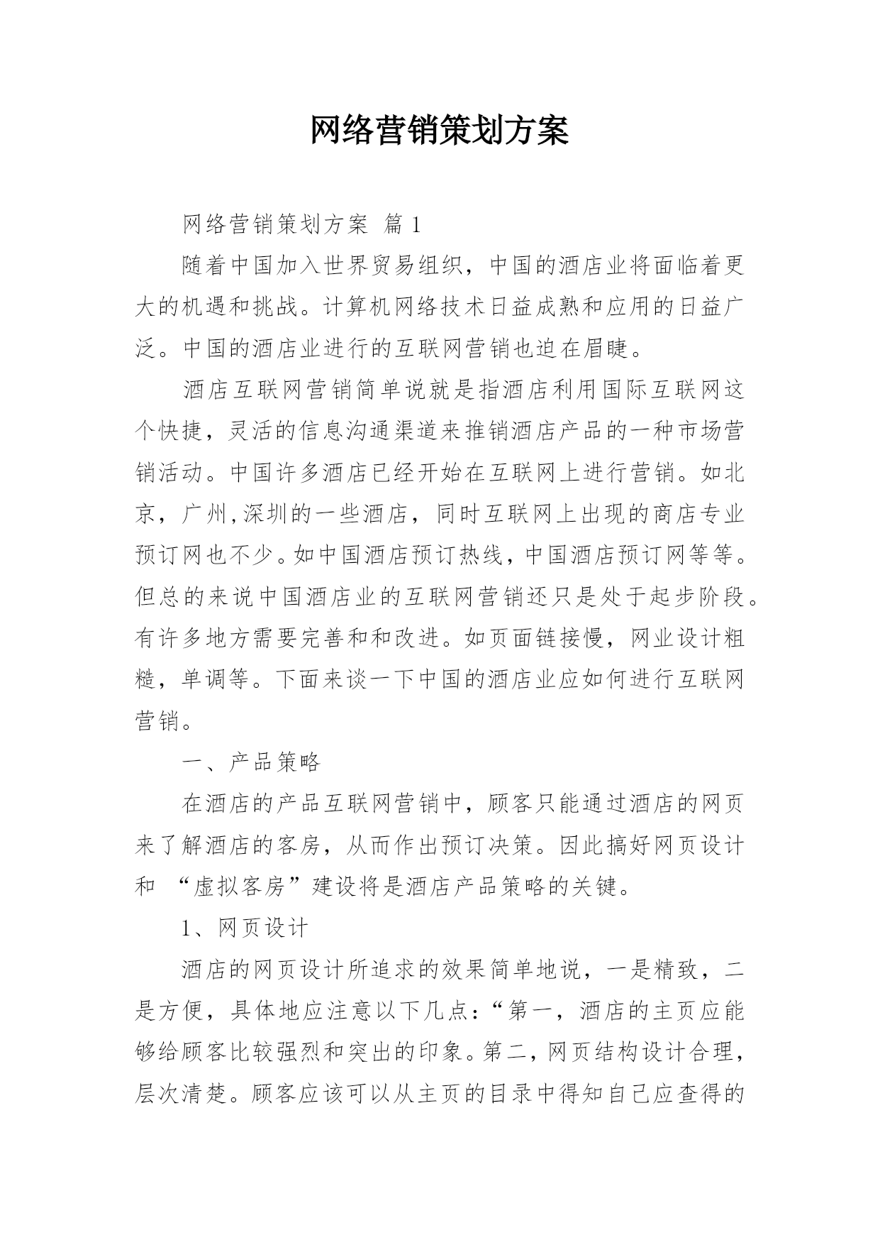 网络营销策划方案网络营销策划方案篇1随着中国加入世界贸易组织,中国的酒店业将面临着更大的机遇和挑战。计算机网络技术日益成熟和应用的日益广泛。中国的酒店业进行的互联网营销也迫在眉睫。酒店互联网营销简单说就是指酒店利用国际互联网这个快捷,灵活的信息沟通渠道来推销酒店产品的一种市场营销活动。中国许多酒店已经开始在互联网上进行营销。如北京,广州,深圳的一些酒店,同时互联网上出现的商店专业预订网也不少。如中国酒店预订热线,中国酒店预订网等等。但总的来说中国酒店业的互联网营销还只是处于起步阶段。有许多地方需要完善和和