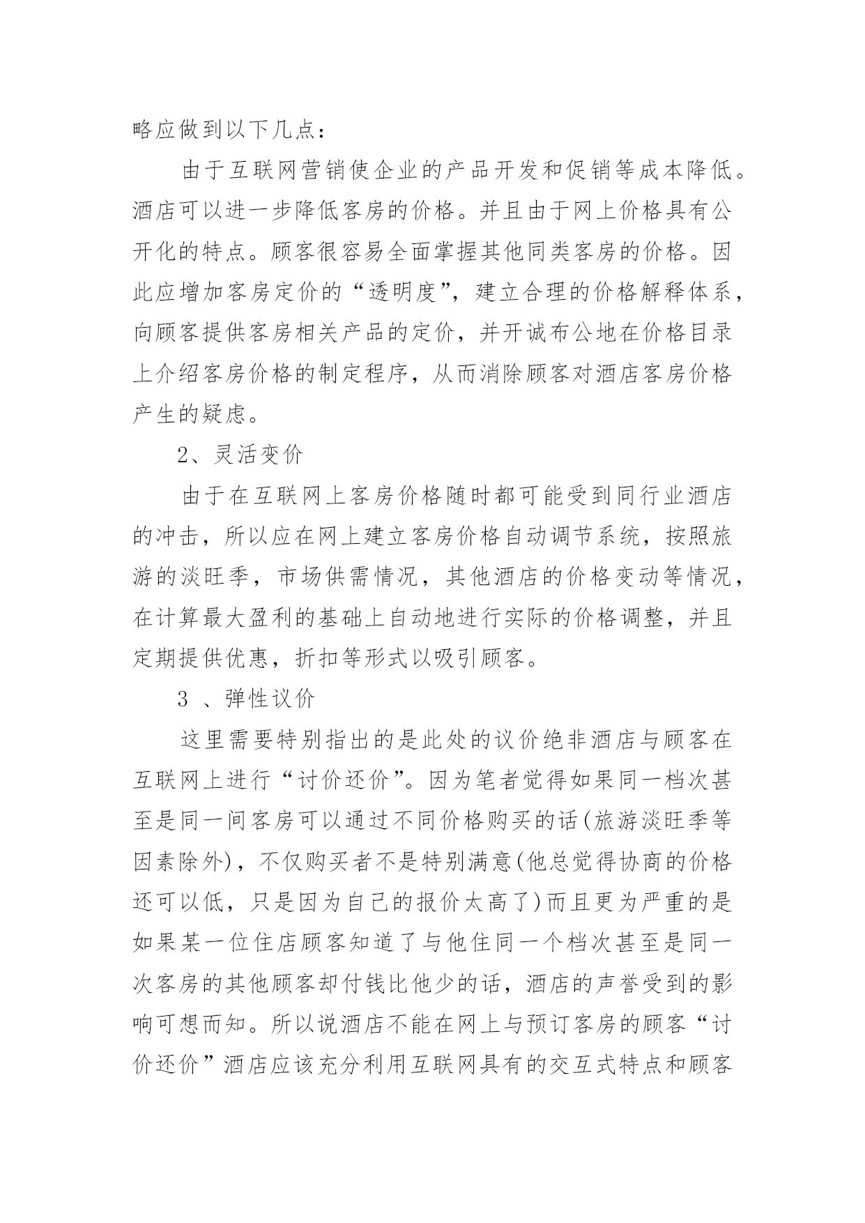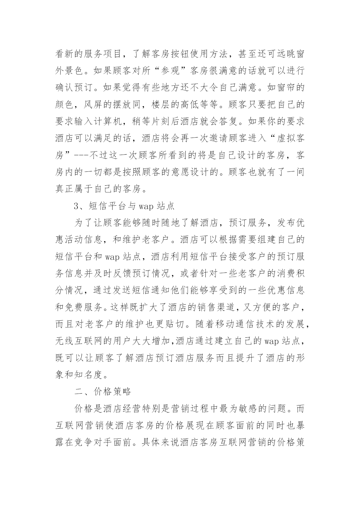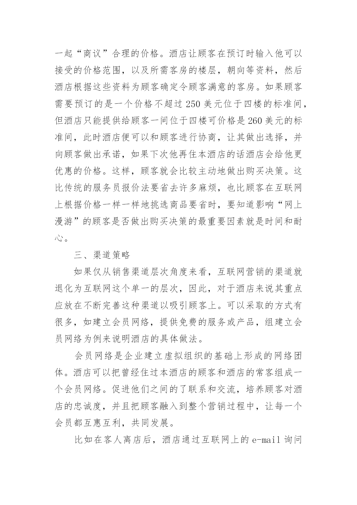 网络营销策划方案网络营销策划方案篇1随着中国加入世界贸易组织,中国的酒店业将面临着更大的机遇和挑战。计算机网络技术日益成熟和应用的日益广泛。中国的酒店业进行的互联网营销也迫在眉睫。酒店互联网营销简单说就是指酒店利用国际互联网这个快捷,灵活的信息沟通渠道来推销酒店产品的一种市场营销活动。中国许多酒店已经开始在互联网上进行营销。如北京,广州,深圳的一些酒店,同时互联网上出现的商店专业预订网也不少。如中国酒店预订热线,中国酒店预订网等等。但总的来说中国酒店业的互联网营销还只是处于起步阶段。有许多地方需要完善和和