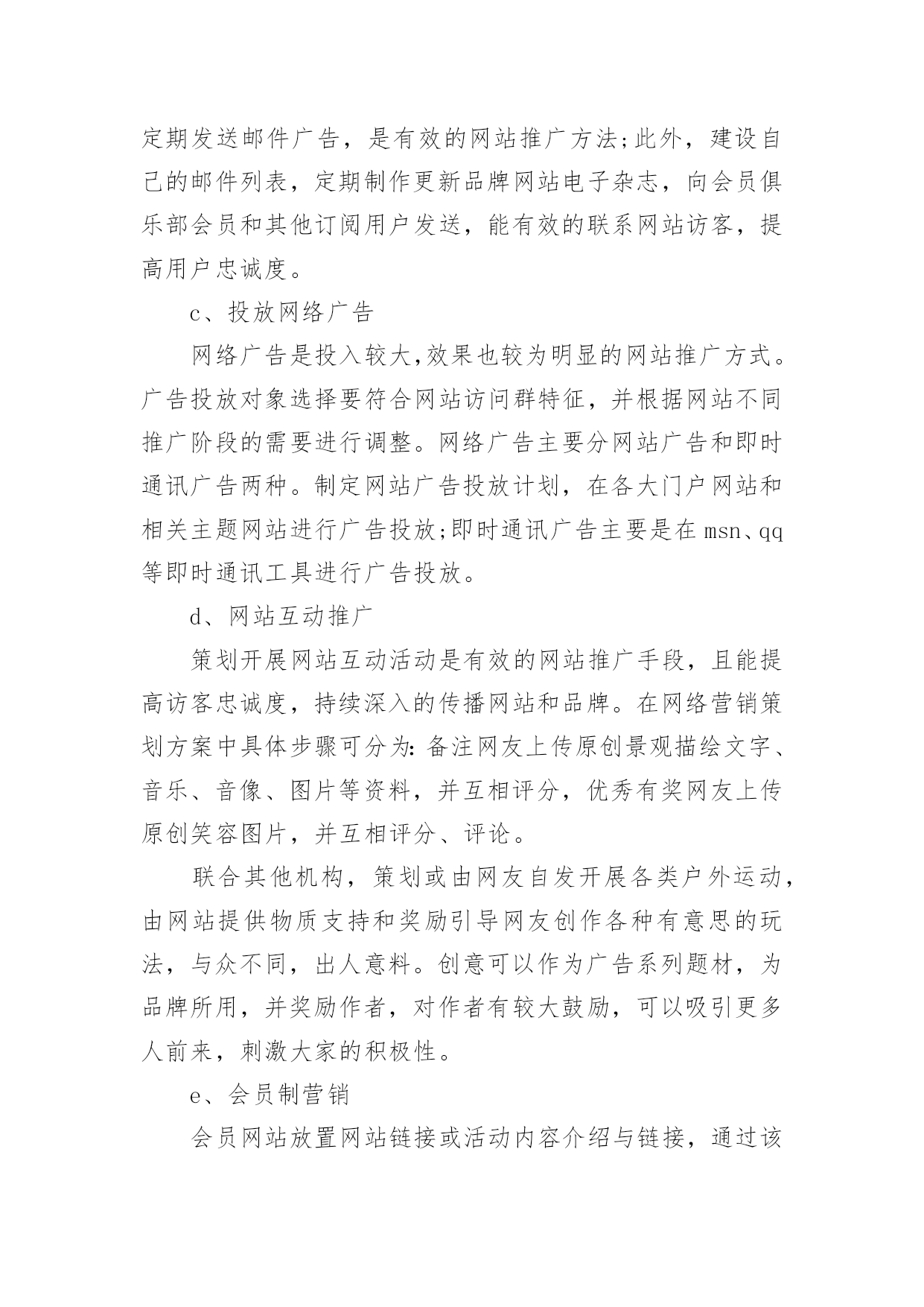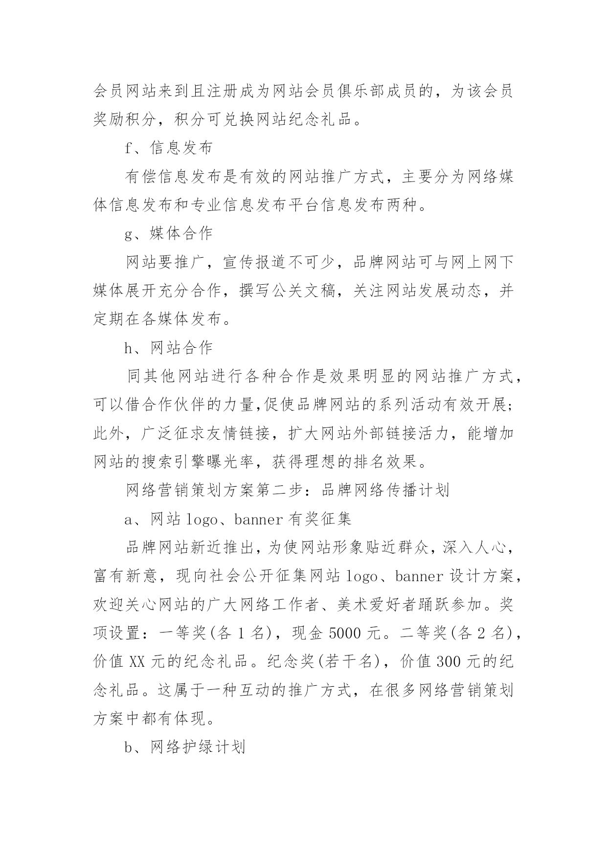 网络营销策划方案网络营销策划方案(合集15篇)为确保事情或工作高质量高水平开展,时常需要预先制定方案,方案属于计划类文书的一种。那么制定方案需要注意哪些问题呢?下面是小编收集整理的网络营销策划方案,供大家参考借鉴,希望可以帮助到有需要的朋友。网络营销策划方案1一、网站1、网站流量安装一套流量统计系统,可以清晰的判断网站目前所有营销手段的效果,并且还可以到:(1)、流量来路统计可以清晰的统计到每年、每月、每日、客流是通过什么渠道来到网站的。可以清晰判断各种推广方法的效果。(2)、浏览页面和入口可以判断网站中