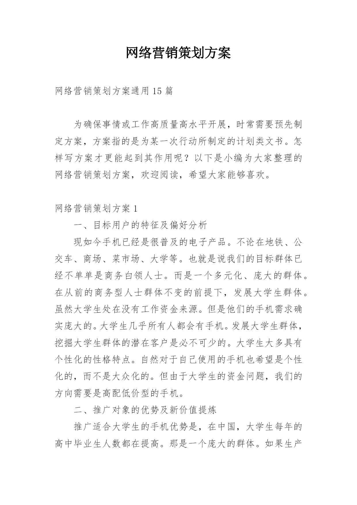 网络营销策划方案网络营销策划方案通用15篇为确保事情或工作高质量高水平开展,时常需要预先制定方案,方案指的是为某一次行动所制定的计划类文书。怎样写方案才更能起到其作用呢?以下是小编为大家整理的网络营销策划方案,欢迎阅读,希望大家能够喜欢。网络营销策划方案1一、目标用户的特征及偏好分析现如今手机已经是很普及的电子产品。不论在地铁、公交车、商场、菜市场、大学等。也就是说我们的目标群体已经不单单是商务白领人士。而是一个多元化、庞大的群体。在从前的商务型人士群体不变的前提下,发展大学生群体。虽然大学生处在没有工作