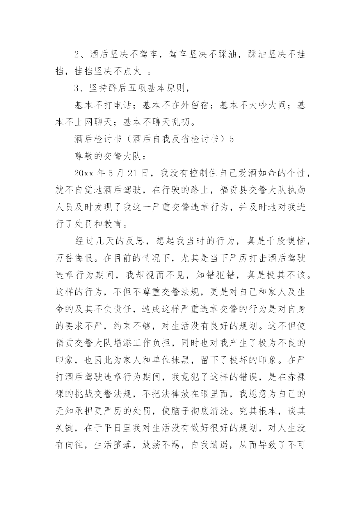 酒后检讨书酒后自我反省检讨书酒后检讨书(酒后自我反省检讨书)在学习、工作或生活中出现了问题或过错后,为了避免再犯,为此要写检讨书来自我悔过,在写检讨书的时候要注意用语诚恳。怎样写检讨书才能做到语言准确呢?下面是小编为大家收集的酒后检讨书(酒后自我反省检讨书),欢迎大家分享。酒后检讨书(酒后自我反省检讨书)1我今年28岁,我是一名司机,已在职工作6年了。今天我怀着无比内疚的心情,向关爱我的人做检讨:事情发生后,我的心情非常沉重,我明白,由于我一时大意、一时糊涂,造成了交通事故。因此我深深地懊悔不已,在此深刻