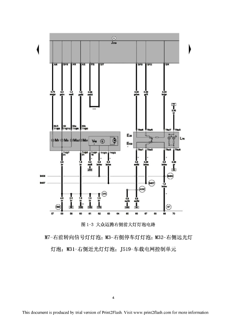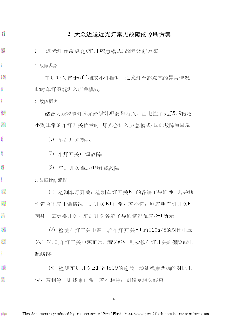 摘要伴随我国科技的高速发展和国民生产水平的改善,现代轿车的快速发展,轿车的设计变得更复杂,科技能力不断提高。汽车前照灯的故障诊断和维修在汽车修理中占有重要的地位。汽车前照灯工作质量的好坏直接影响到驾车安全性和驾驶人的驾驶感受,其故障诊断具有重要意义。本设计对迈腾前照灯常见故障进行分析,并故障进行诊断方案的设计,给汽车维修人员和驾驶人提供一些参考依据。关键字:迈腾;前照灯;故障诊断ThisdocumentisproducedbytrialversionofPrint2Flash.Visitwww.print