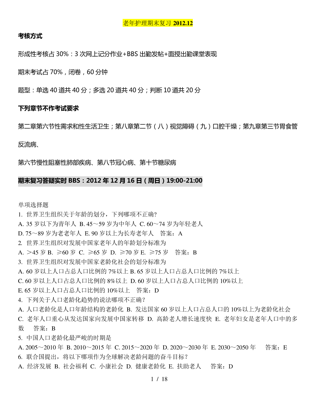 老年护理期末复习2012.12考核方式形成性考核占30%:3次网上记分作业+BBS出勤发帖+面授出勤课堂表现期末考试占70%,闭卷,60分钟题型:单选40道共40分;多选20道共40分;判断10道共20分下列章节不作考试要求第二章第六节性需求和性生活卫生;第八章第二节(八)视觉障碍(九)口腔干燥;第九章第三节胃食管反流病、第六节慢性阻塞性肺部疾病、第八节冠心病、第十节糖尿病期末复习答疑实时BBS:2012年12月16日(周日)19:00-21:00单项选择题世界卫生组织关于年龄的划分,下列哪项不正确?35