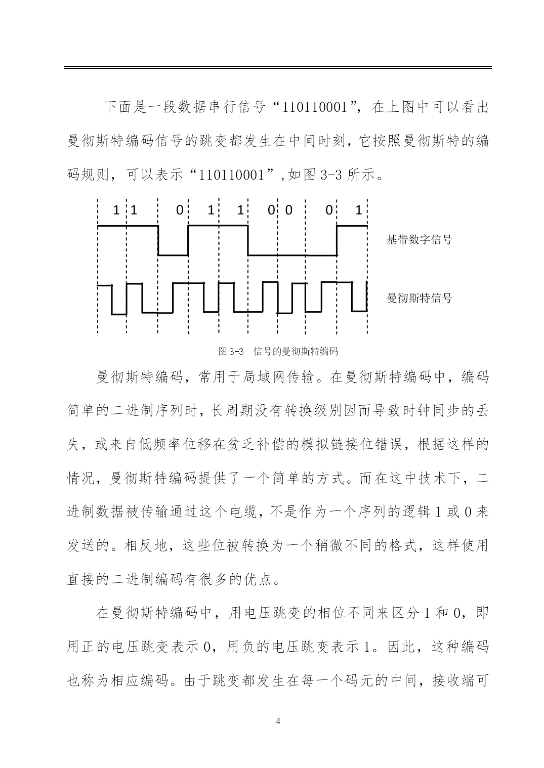 毕业设计PAGEIII东北大学毕业设计(论文)东北大学继续教育学院教务处毕业设计(论文)GRADUATEDESIGN(THESIS)设计(论文)题目基于FPGA的曼切斯特编码的设计学生学习中心专业电气工程及其自动化指导教师东北大学继续教育学院毕业设计(论文)摘要在电信领域,曼彻斯特码是一种数据通讯线性码,它的每一个数据比特都是由至少一次电压转换的形式所表示的。它是一种超越传统数字传输的信道编码技术,同时被认为是一种自定时码。自定时就意味着完全可以实现数据流的精确同步。每一个比特都准确的在一个预先定义