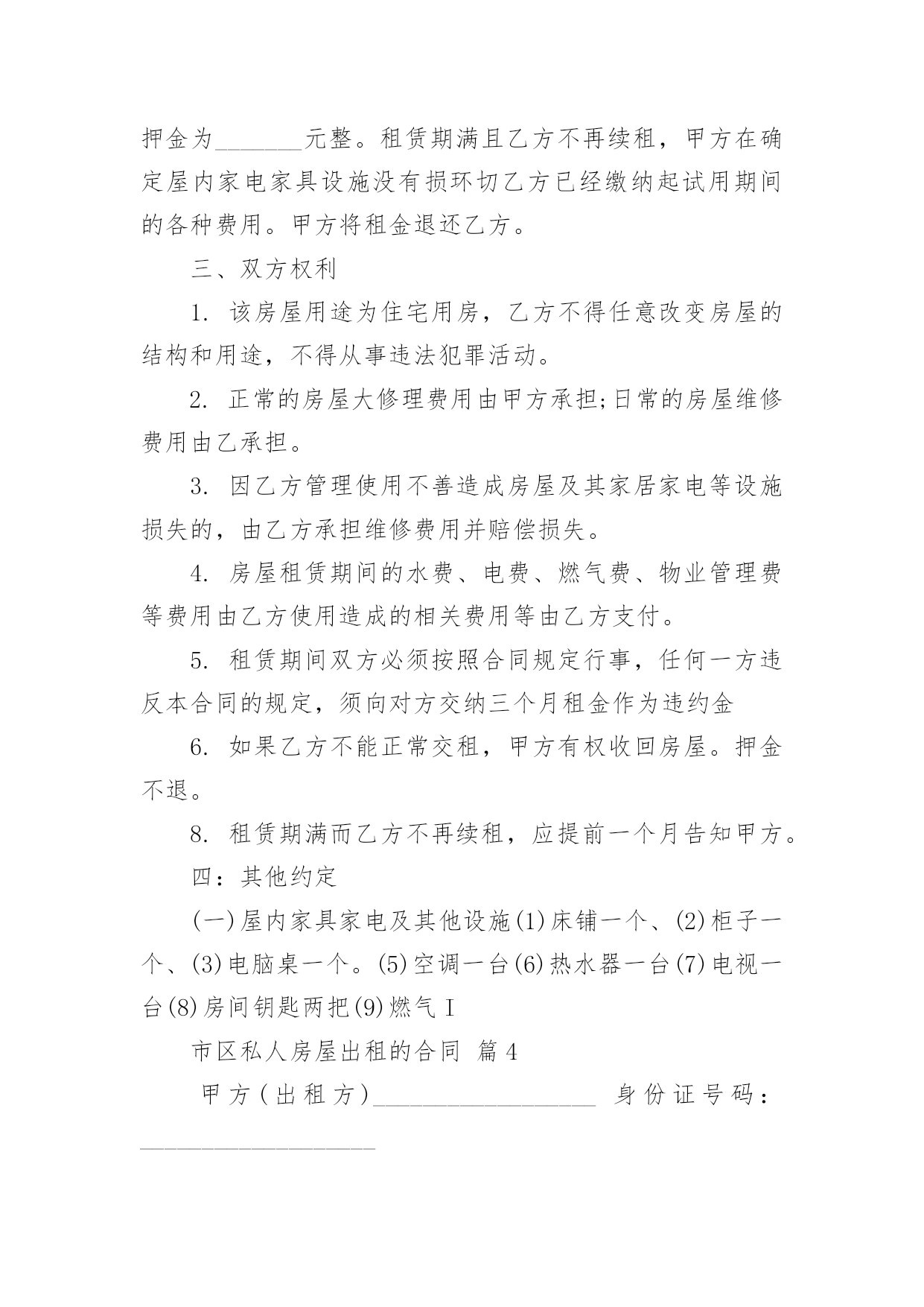 市区私人房屋出租合同在人们的法律意识不断增强的社会,合同在生活中的使用越来越广泛,签订合同能平衡双方当事人的平等地位。那么正式、规范的合同是什么样的呢?下面是小编整理的市区私人房屋出租合同,供大家参考借鉴,希望可以帮助到有需要的朋友。市区私人房屋出租合同1出租方:______承租方:______以下简称乙方甲乙双方根据《民法典》平等自愿、诚实信用的原则,经友好协商,就租赁房屋一事达成以下协议:1、甲方将位于成都市高新西区尚阳路“___”小区,__栋__单元__房号房屋出租给乙方。2、租赁期限为一年,从__