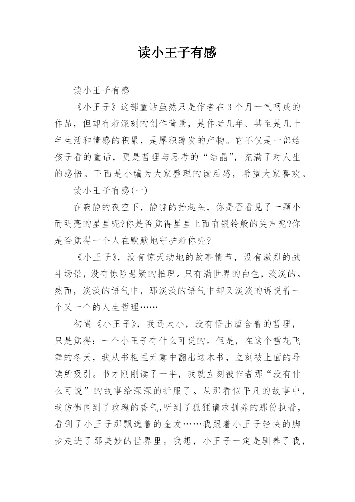 读小王子有感读小王子有感《小王子》这部童话虽然只是作者在3个月一气呵成的作品,但却有着深刻的创作背景,是作者几年、甚至是几十年生活和情感的积累,是厚积薄发的产物。它不仅是一部给孩子看的童话,更是哲理与思考的“结晶”,充满了对人生的感悟。下面是小编为大家整理的读后感,希望大家喜欢。读小王子有感(一)在寂静的夜空下,静静的抬起头,你是否看见了一颗小而明亮的星星呢?你是否觉得星星上面有银铃般的笑声呢?你是否觉得一个人在默默地守护着你呢?《小王子》,没有惊天动地的故事情节,没有激烈的战斗场景,没有惊险悬疑的推理。