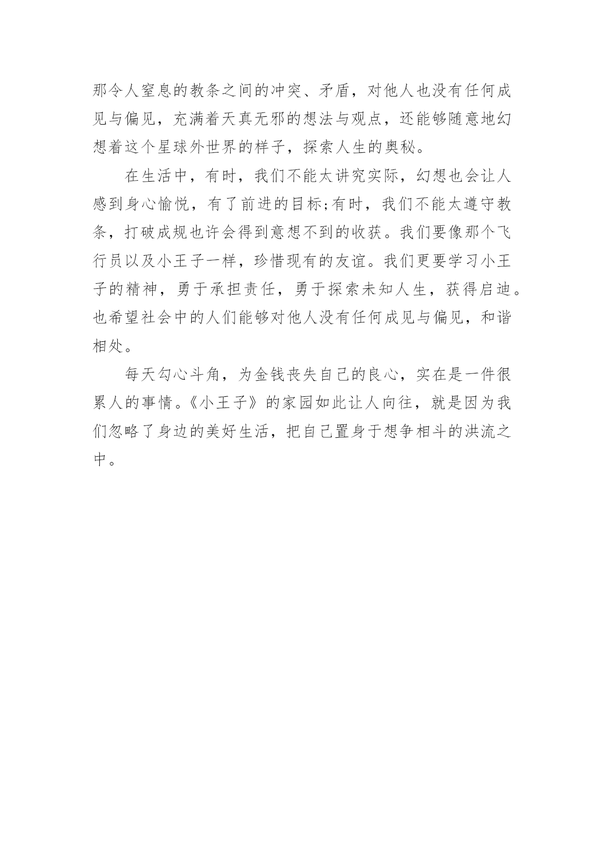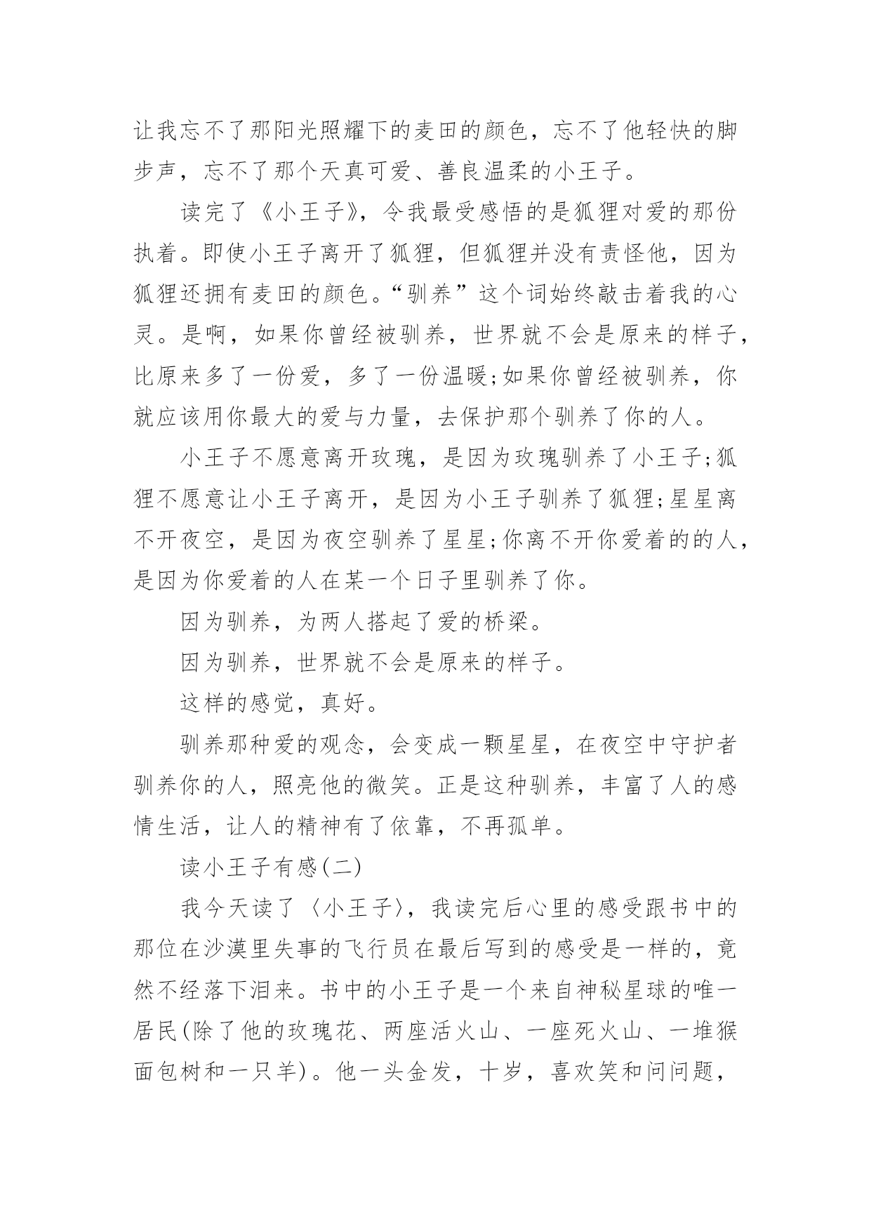 读《小王子》有感读《小王子》有感精选(15篇)当仔细品读一部作品后,你有什么总结呢?这时最关键的读后感不能忘了哦。是不是无从下笔、没有头绪?下面是小编精心整理的读《小王子》有感,希望能够帮助到大家。读《小王子》有感1想一想大家是否应当在特殊的情况下,可以学会放下自身的身姿,去述说自身的感情,尘世间沒有几回表述真心实意的机遇,大家应当好好地的掌握。小王子以后碰到了其他星球上的一些千奇百怪的人,要我印象深刻的有两个星球上的人。小王子不了解那么颇具有哪些实际意义,但是哪个颇具的人却感觉要是有着了財富什么都可以干