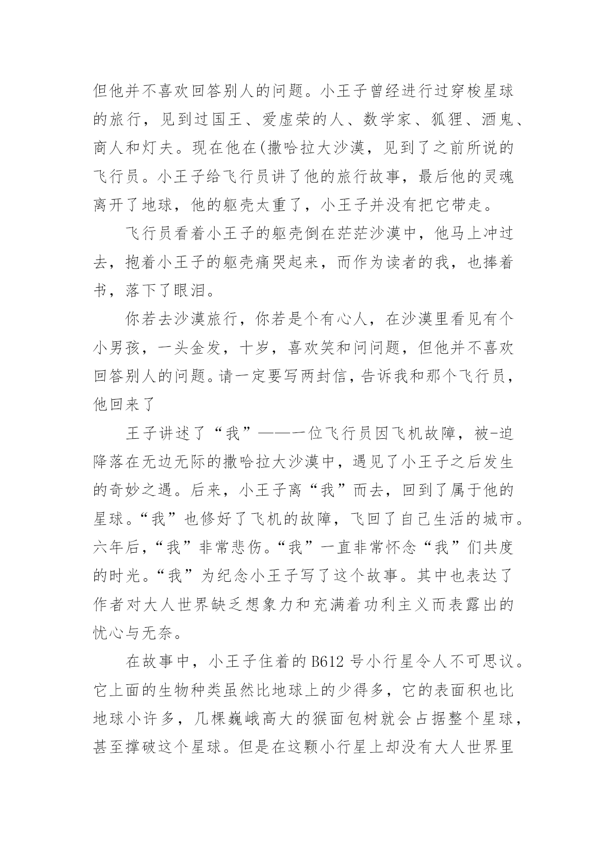 读《小王子》有感读《小王子》有感【热】当仔细品读一部作品后,大家心中一定是萌生了不少心得体会,此时需要认真地做好记录,写写读后感了。为了让您不再为写读后感头疼,下面是小编收集整理的读《小王子》有感,欢迎大家分享。读《小王子》有感1最近我读了一本书,非常的好看,让我入了神,名叫《小王子》,故事中的小王子呀,勇敢顽强,拥有一颗纯洁的心。这篇故事讲述了一位飞行家因飞机出了故障,落在了一个名叫撒哈拉的沙漠,就在飞行家修理飞机的第二天,一位来自外星星球的小小人--------小王子来到了他身边,飞行家和小王子成了好