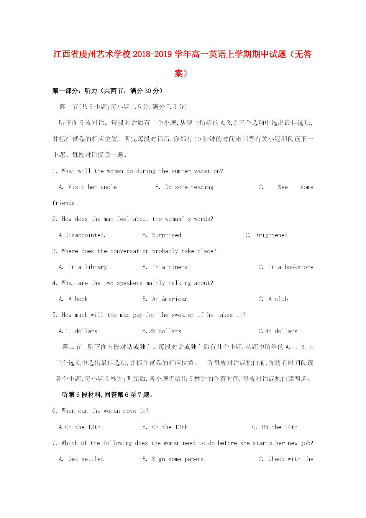 江西省虔州艺术学校2018-2019学年高一英语上学期期中试题(无答案)第一部分:听力(共两节,满分30分)第一节(共5小题;每小题1.5分,满分7.5分)听下面5段对话。每段对话后有一个小题,从题中所给的A,B,C三个选项中选出最佳选项,并标在试卷的相应位置。听完每段对话后,你都有10秒钟的时间来回答有关小题和阅读下一小题。每段对话仅读一遍。1.Whatwillthewomandoduringthesummervacation?A.VisitheruncleB.DosomereadingC.Seesom