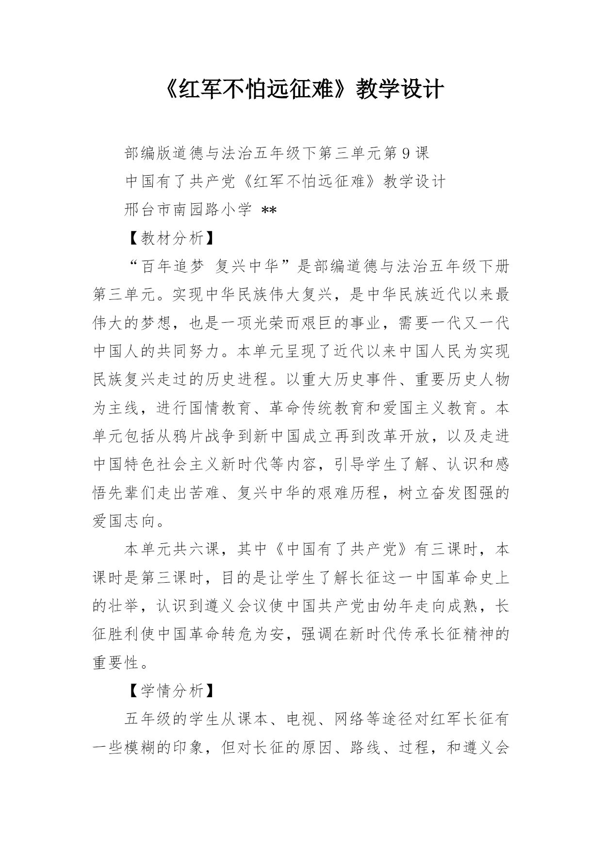 《红军不怕远征难》教学设计部编版道德与法治五年级下第三单元第9课中国有了共产党《红军不怕远征难》教学设计邢台市南园路小学**【教材分析】“百年追梦复兴中华”是部编道德与法治五年级下册第三单元。实现中华民族伟大复兴,是中华民族近代以来最伟大的梦想,也是一项光荣而艰巨的事业,需要一代又一代中国人的共同努力。本单元呈现了近代以来中国人民为实现民族复兴走过的历史进程。以重大历史事件、重要历史人物为主线,进行国情教育、革命传统教育和爱国主义教育。本单元包括从鸦片战争到新中国成立再到改革开放,以及走进中国特色社会主义