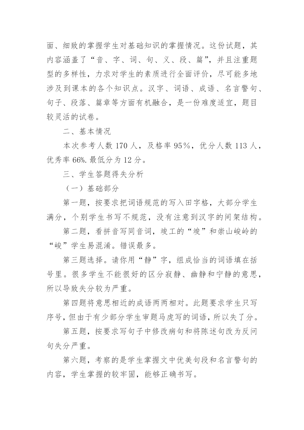 语文试卷分析(精)语文试卷分析无论在学习或是工作中,我们很多时候都不得不用到试卷,成绩的提高,最关键的是什么的呢,重要的是多做题目,多写试卷,总结知识点,一份好的试卷都是什么样子的呢?下面是小编为大家整理的语文试卷分析,仅供参考,希望能够帮助到大家。语文试卷分析篇1一、卷面分析本次测试题量适中,从基础知识,基本技能,阅读理解和写作等几方面对学生进行了一次综合性的测评。(一)、取得的成绩1、基础知识掌握比较扎实。拼读能力以及字、词的书写,理解和应用能力均有大幅度的提高。能够区分形近字,多音字,能够掌握词语,