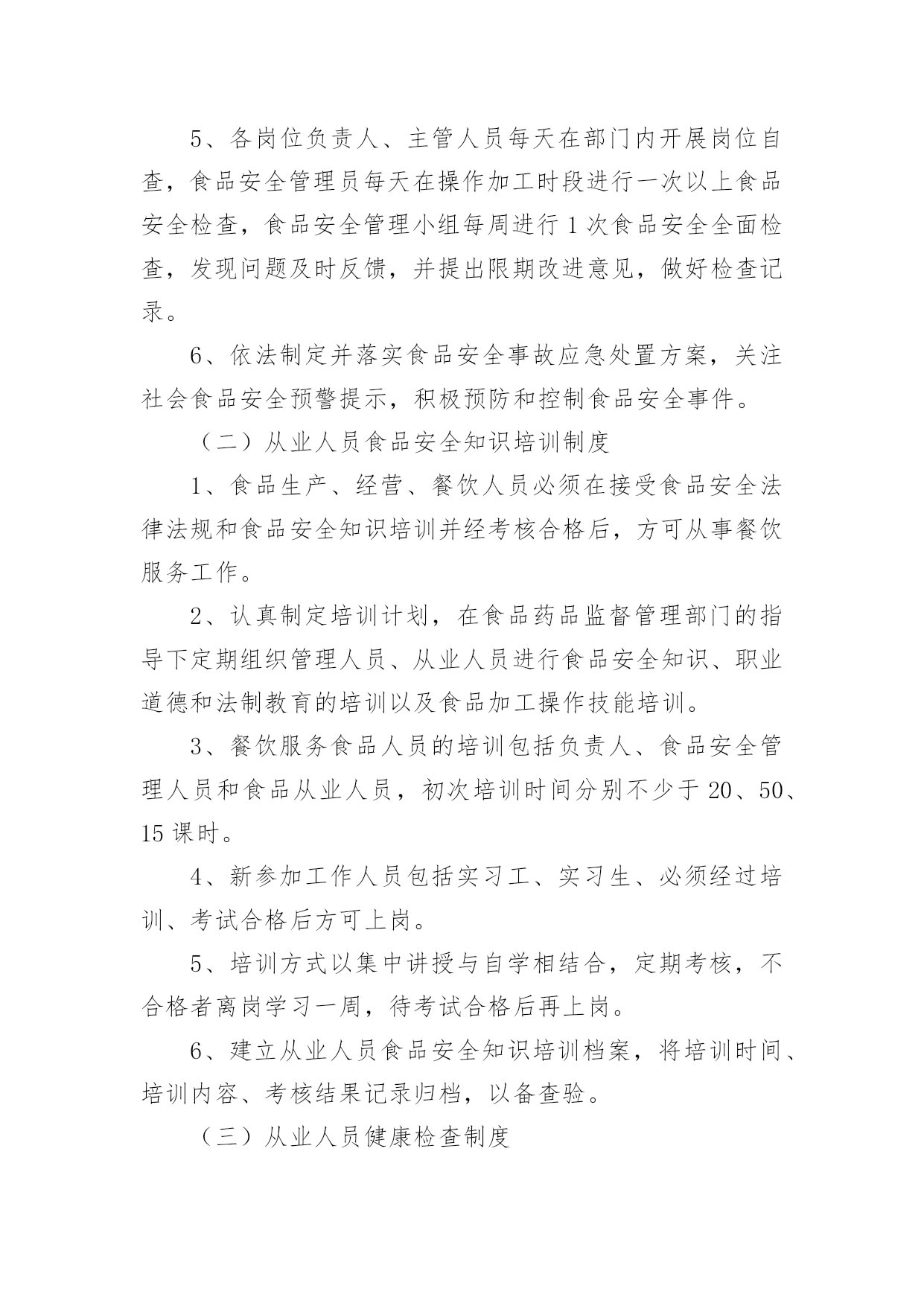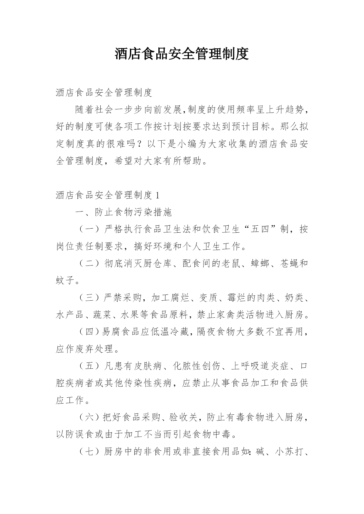 酒店食品安全管理制度酒店食品安全管理制度随着社会一步步向前发展,制度的使用频率呈上升趋势,好的制度可使各项工作按计划按要求达到预计目标。那么拟定制度真的很难吗?以下是小编为大家收集的酒店食品安全管理制度,希望对大家有所帮助。酒店食品安全管理制度1一、防止食物污染措施(一)严格执行食品卫生法和饮食卫生“五四”制,按岗位责任制要求,搞好环境和个人卫生工作。(二)彻底消灭厨仓库、配食间的老鼠、蟑螂、苍蝇和蚊子。(三)严禁采购,加工腐烂、变质、霉烂的肉类、奶类、水产品、蔬菜、水果等食品原料,禁止家禽类活物进入厨房