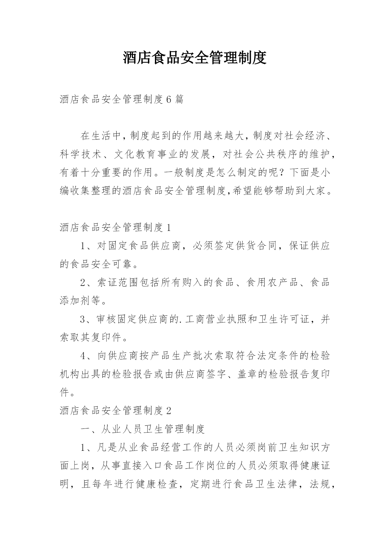 酒店食品安全管理制度酒店食品安全管理制度在日常生活和工作中,各种制度频频出现,制度是国家法律、法令、政策的具体化,是人们行动的准则和依据。拟定制度需要注意哪些问题呢?以下是小编为大家收集的酒店食品安全管理制度,仅供参考,希望能够帮助到大家。酒店食品安全管理制度11、对固定食品供应商,必须签定供货合同,保证供应的食品安全可靠。2、索证范围包括所有购入的食品、食用农产品、食品添加剂等。3、审核固定供应商的`工商营业执照和卫生许可证,并索取其复印件。4、向供应商按产品生产批次索取符合法定条件的检验机构出具的检验