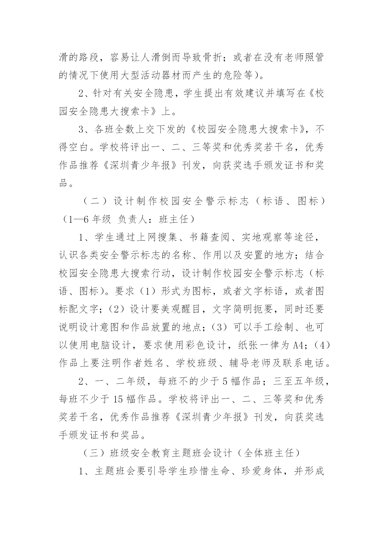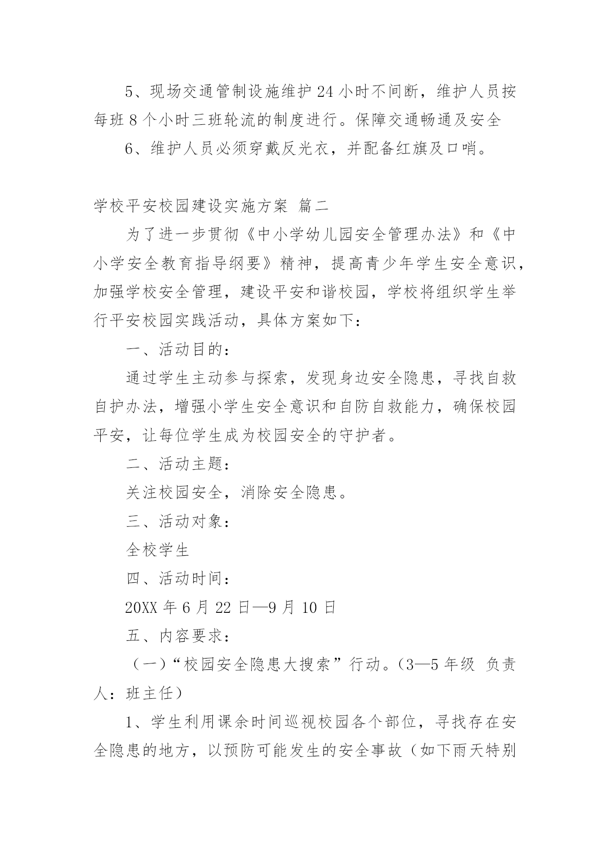 平安校园建设实施方案(精品多篇)说明:平安校园建设实施方案(精品多篇)为的会员投稿推荐,但愿对你的学习工作带来帮助。校园安全建设实施方案篇一六月份是我省学校安全教育月,根据XX市教育体育局和镇教育办“安全教育月”活动要求,特制定我校“安全教育月”活动实施方案如下:一、活动主题:“抓好基层基础,确保学生安全”;“安全伴我在校园,我把安全带回家”。二、主要活动内容采取多种形式,组织开展“安全伴我在校园,我把安全带回家”主题教育。统一开展好“六个一”活动。1、结合夏季特点和学校实际,就常见和易发生的学校安全事故