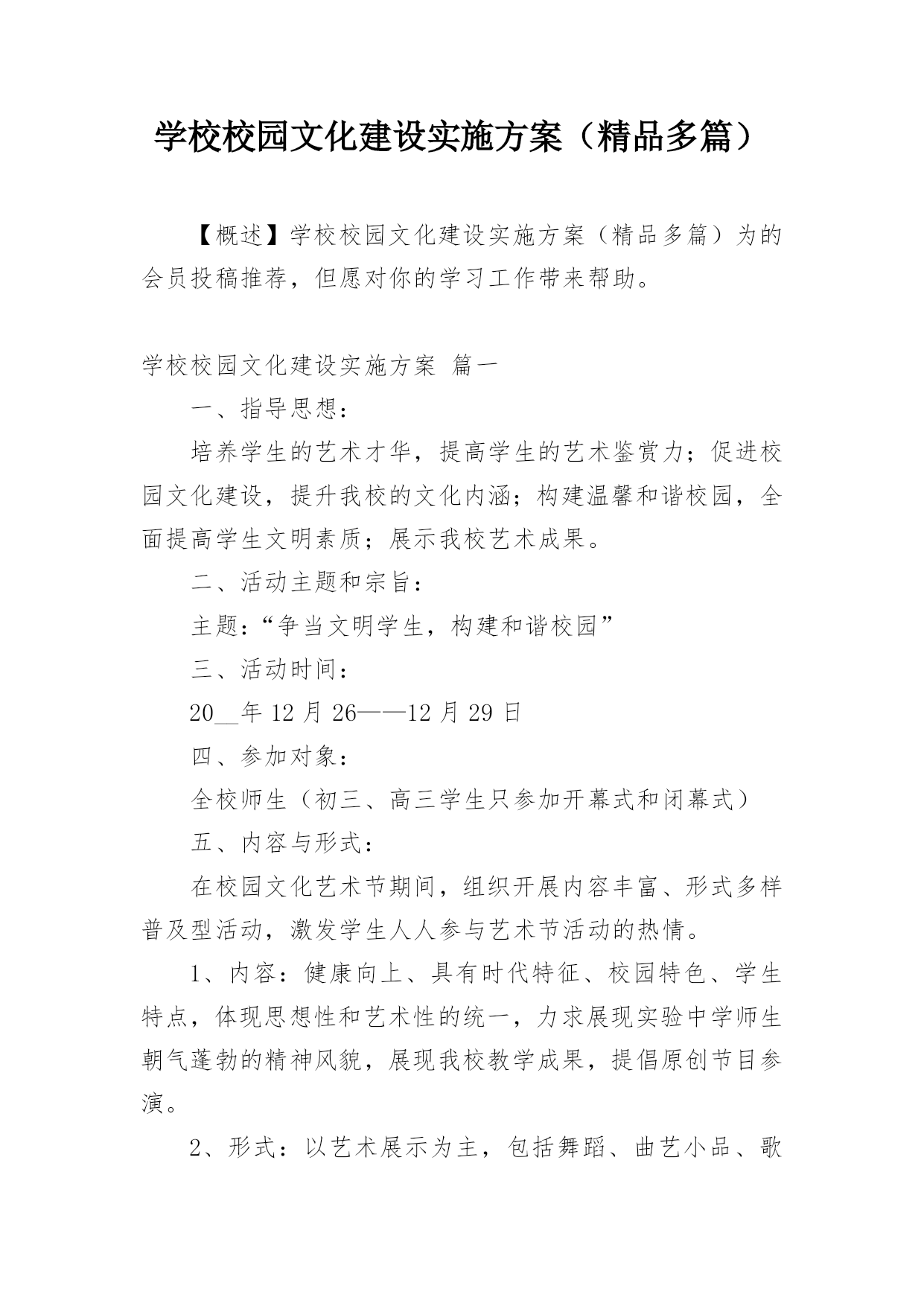 学校校园文化建设实施方案(精品多篇)【概述】学校校园文化建设实施方案(精品多篇)为的会员投稿推荐,但愿对你的学习工作带来帮助。学校校园文化建设实施方案篇一一、指导思想:培养学生的艺术才华,提高学生的艺术鉴赏力;促进校园文化建设,提升我校的文化内涵;构建温馨和谐校园,全面提高学生文明素质;展示我校艺术成果。二、活动主题和宗旨:主题:“争当文明学生,构建和谐校园”三、活动时间:20__年12月26——12月29日四、参加对象:全校师生(初三、高三学生只参加开幕式和闭幕式)五、内容与形式:在校园文化艺术节期间,