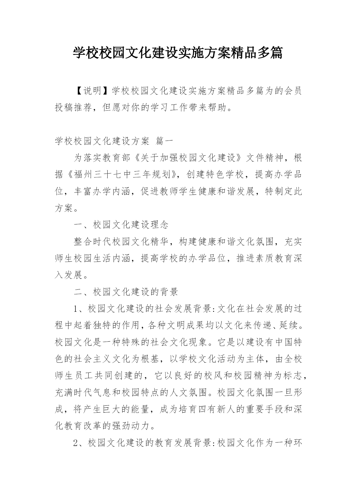 学校校园文化建设实施方案精品多篇【说明】学校校园文化建设实施方案精品多篇为的会员投稿推荐,但愿对你的学习工作带来帮助。学校校园文化建设方案篇一为落实教育部《关于加强校园文化建设》文件精神,根据《福州三十七中三年规划》,创建特色学校,提高办学品位,丰富办学内涵,促进教师学生健康和谐发展,特制定此方案。一、校园文化建设理念整合时代校园文化精华,构建健康和谐文化氛围,充实师生校园生活内涵,提高学校的办学品位,推进素质教育深入发展。二、校园文化建设的背景1、校园文化建设的社会发展背景:文化在社会发展的过程中起着独