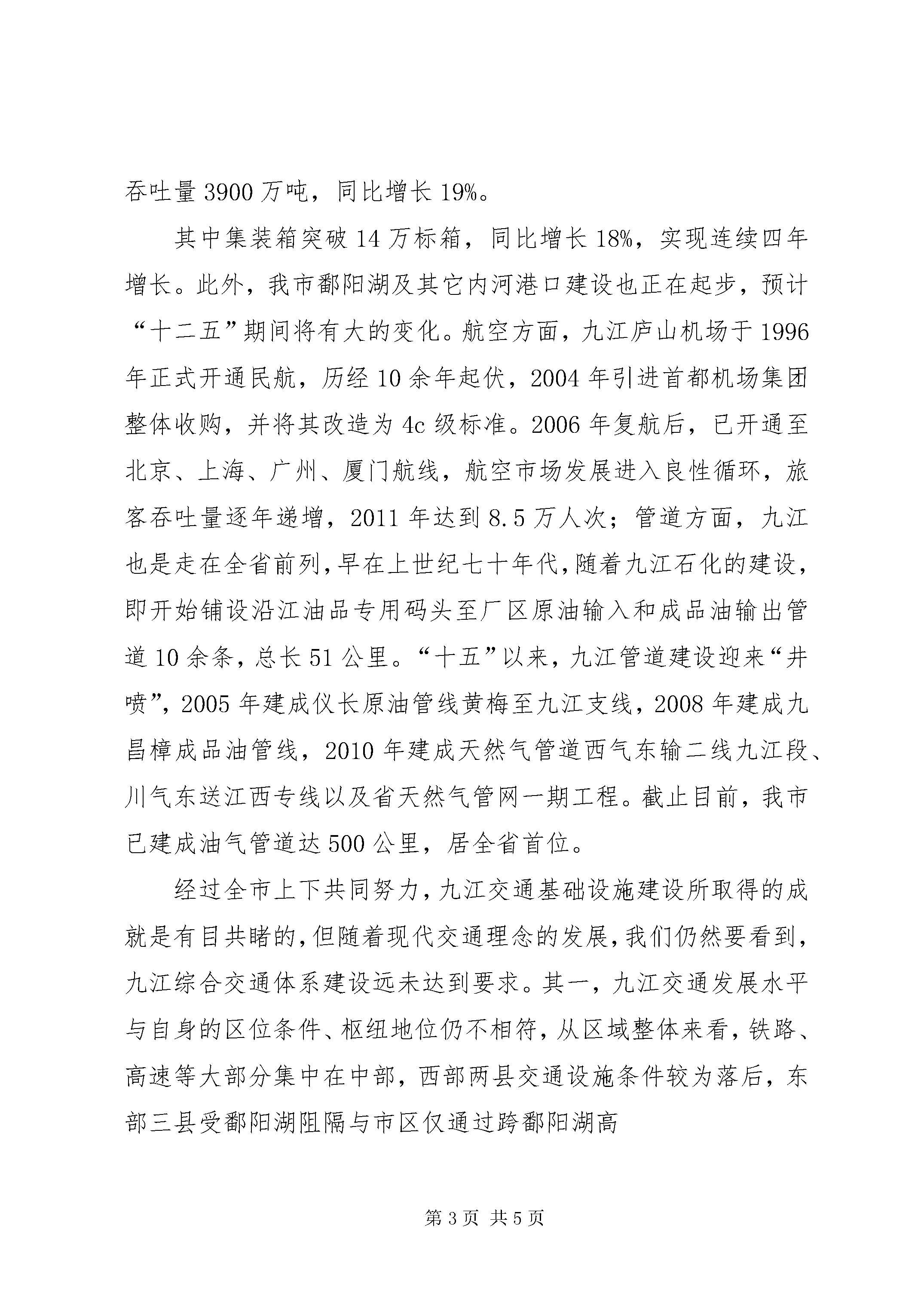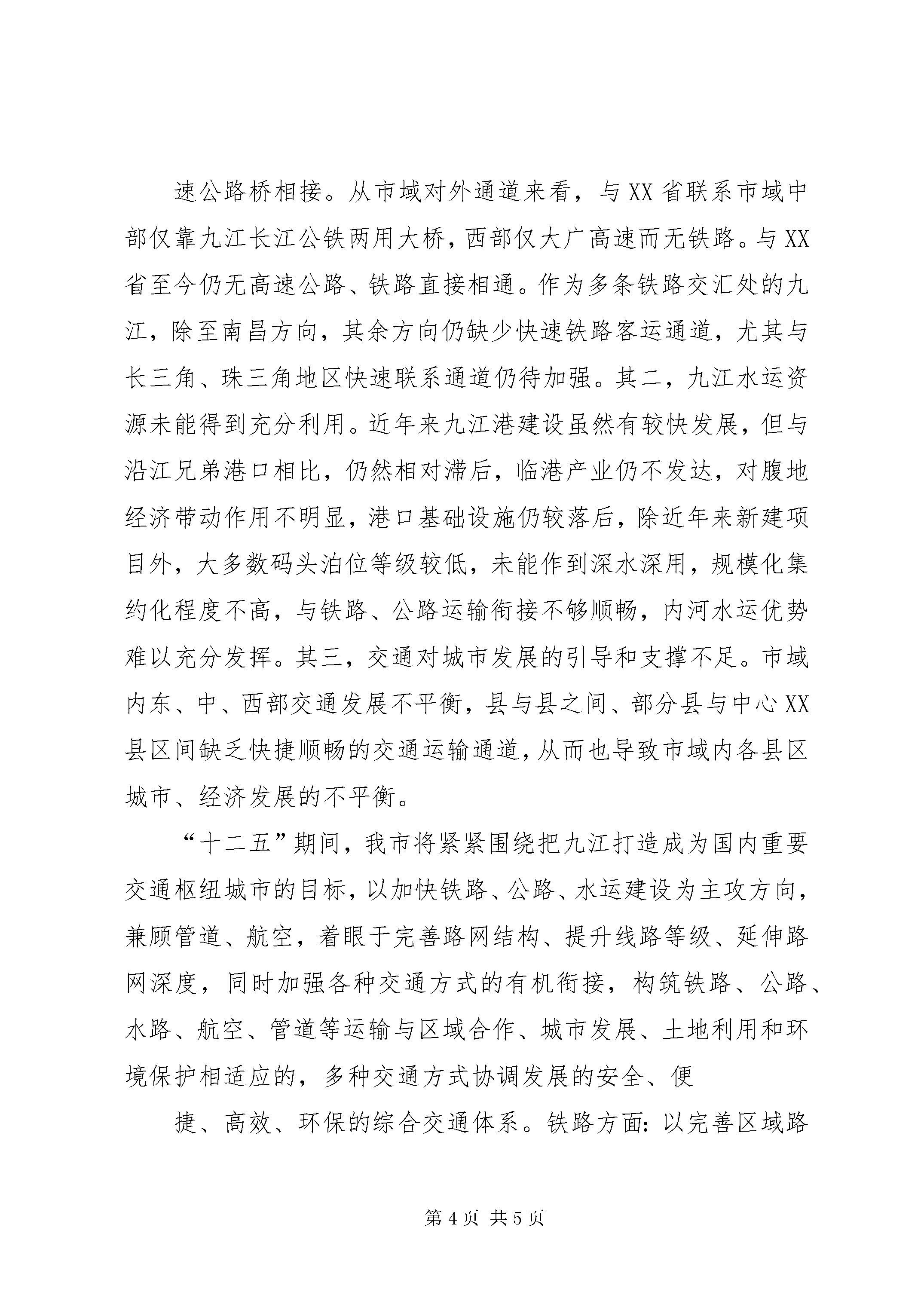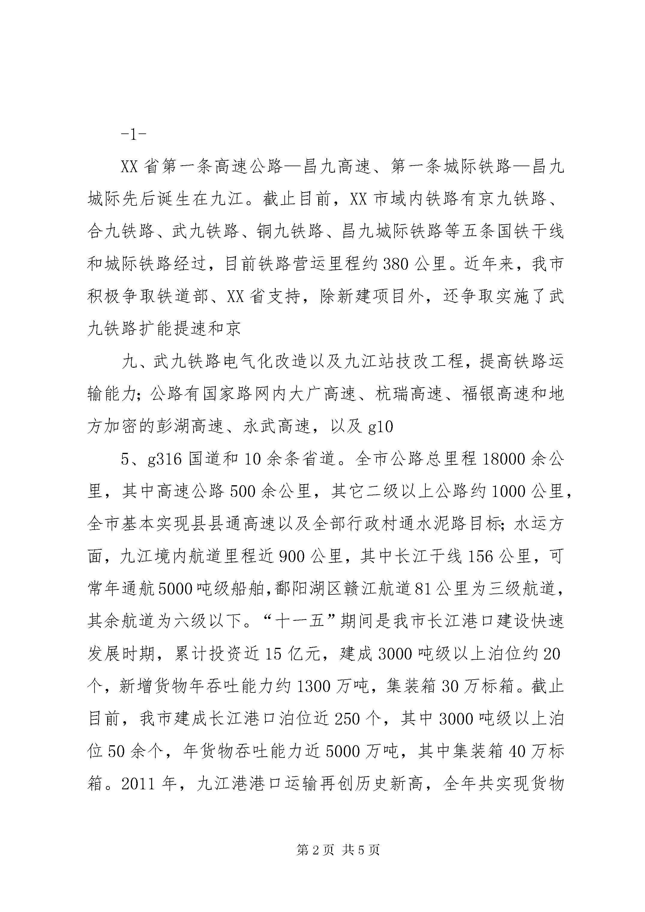XX县区推进交通基础设施建设情况(XX年)范文XX市推进交通基础设施建设有关情况汇报XX市地理位臵独特交通区位条件十分优越。从国家层面看位于国家“五纵五横”综合运输通道的满洲里至港澳台、沿江、上海至瑞丽三大通道交汇处是全国28个主要内河港口之一同时处于促进中部地区崛起、鄱阳湖生态经济区建设两大国家战略受益区;从区域层面看九江地处赣鄂湘皖四省交界襟江带湖直接与皖江城市带、武汉城市圈、长株潭城市群等经济区相对接具备良好的资源流通条件;从本省层面看九江是XX省唯一通江达XX县区是
