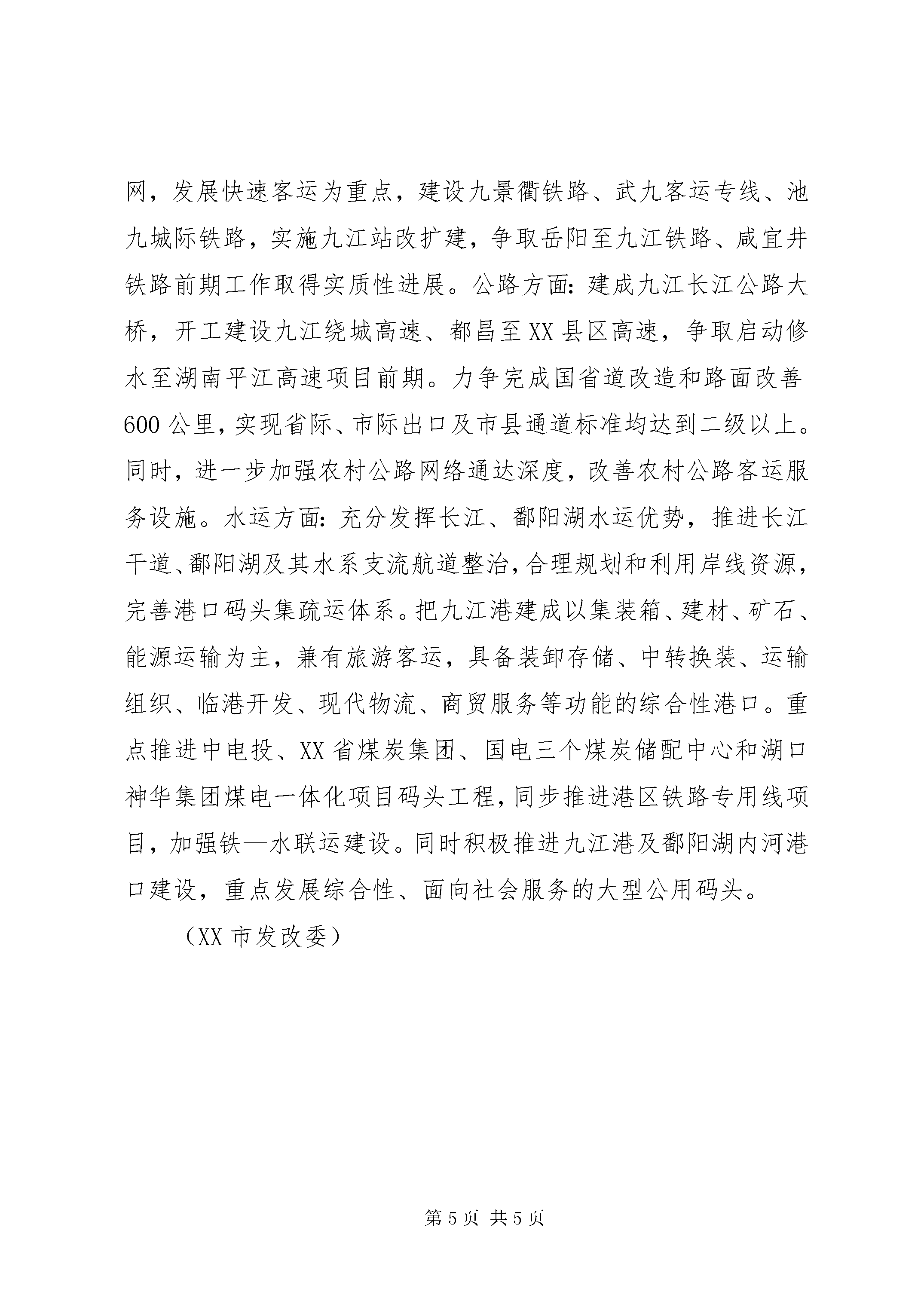 第PAGE\*Arabic\*MERGEFORMAT5页共NUMPAGES\*MERGEFORMAT5页XX县区推进交通基础设施建设情况(XX年)范文XX市推进交通基础设施建设有关情况汇报XX市地理位臵独特,交通区位条件十分优越。从国家层面看,位于国家“五纵五横”综合运输通道的满洲里至港澳台、沿江、上海至瑞丽三大通道交汇处,是全国28个主要内河港口之一,同时处于促进中部地区崛起、鄱阳湖生态经济区建设两大国家战略受益区;从区域层面看,九江地处赣鄂湘皖四省交界,襟江带湖,直接与皖江城市带、武汉城市