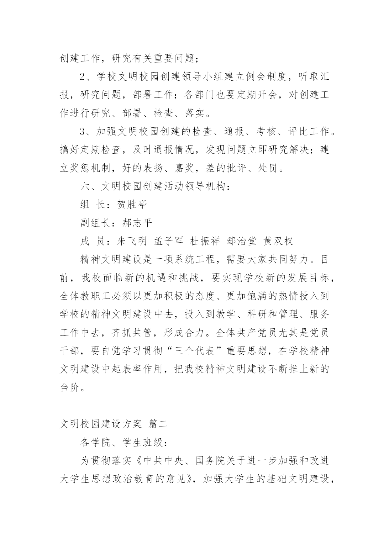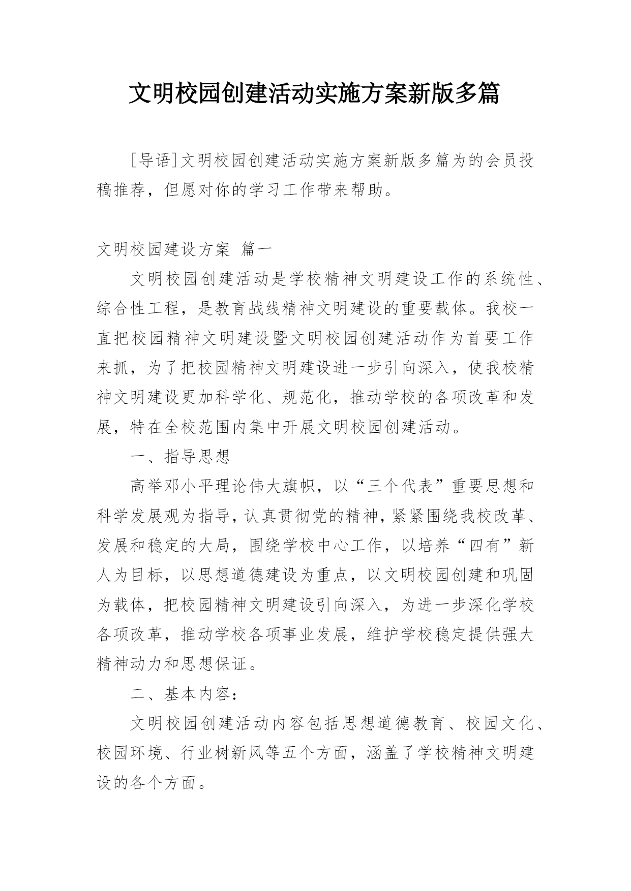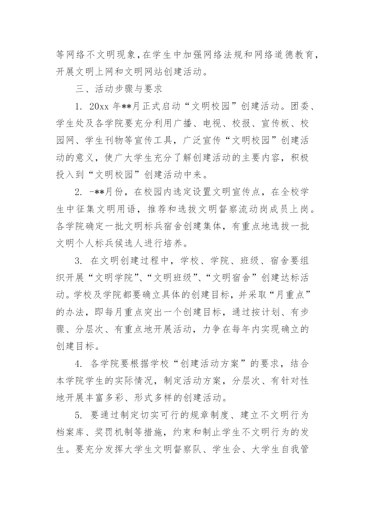 文明校园创建活动实施方案精品多篇【寄语】文明校园创建活动实施方案精品多篇为的会员投稿推荐,但愿对你的学习工作带来帮助。文明校园创建活动实施方案篇一文明校园创建活动是学校精神文明建设工作的系统性、综合性工程,是教育战线精神文明建设的重要载体。我校一直把校园精神文明建设暨文明校园创建活动作为首要工作来抓,为了把校园精神文明建设进一步引向深入,使我校精神文明建设更加科学化、规范化,推动学校的各项改革和发展,特在全校范围内集中开展文明校园创建活动。一、指导思想以“三个代表”重要思想和科学发展观为指导,认真贯彻党的