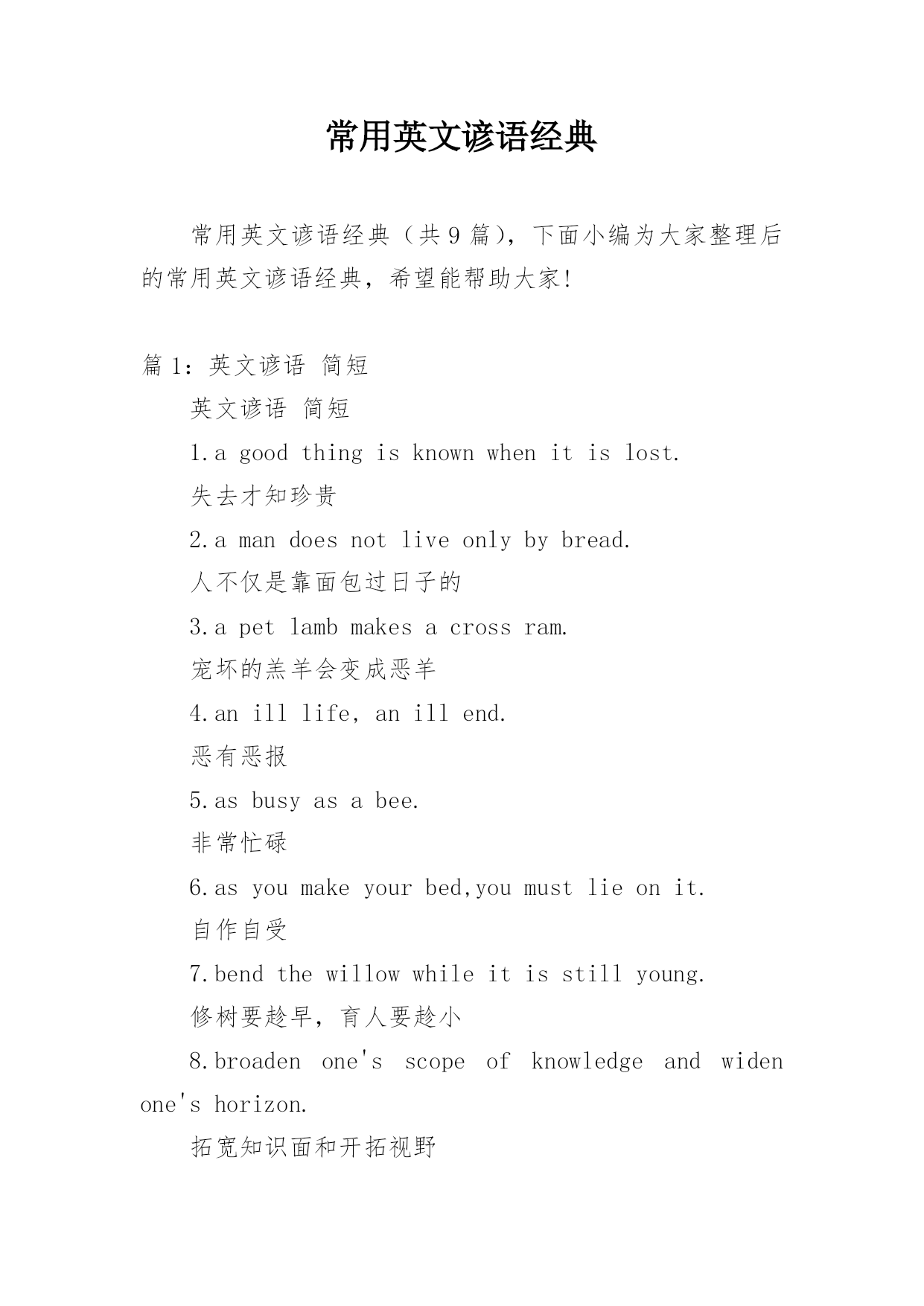 常用英文谚语经典常用英文谚语经典(共9篇),下面小编为大家整理后的常用英文谚语经典,希望能帮助大家!篇1:英文谚语简短英文谚语简短1.agoodthingisknownwhenitislost.失去才知珍贵2.amandoesnotliveonlybybread.人不仅是靠面包过日子的3.apetlambmakesacrossram.宠坏的羔羊会变成恶羊4.anilllife,anillend.恶有恶报5.asbusyasabee.非常忙碌6.asyoumakeyourbed,youmustlieonit