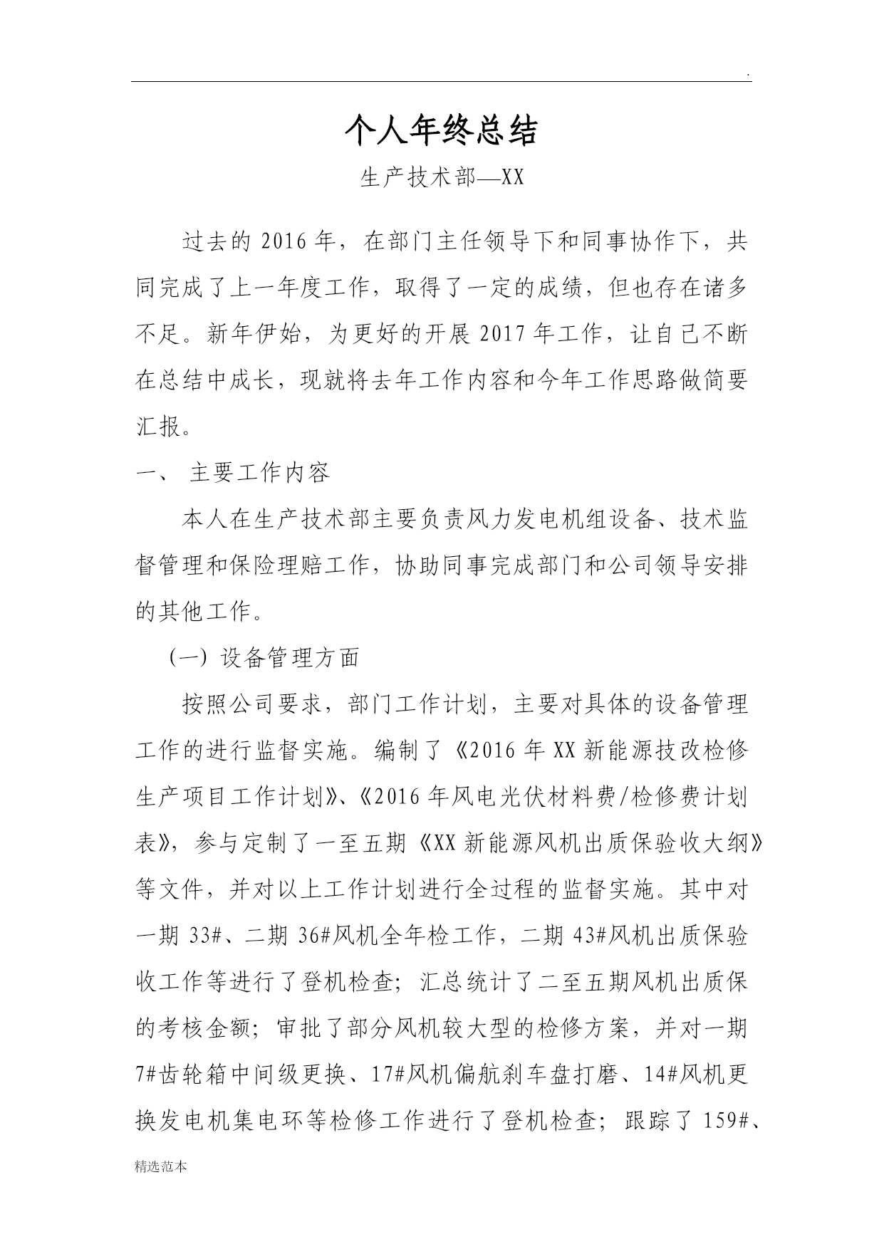 .精选范本个人年终总结生产技术部—XX过去的2016年,在部门主任领导下和同事协作下,共同完成了上一年度工作,取得了一定的成绩,但也存在诸多不足。新年伊始,为更好的开展2017年工作,让自己不断在总结中成长,现就将去年工作内容和今年工作思路做简要汇报。主要工作内容本人在生产技术部主要负责风力发电机组设备、技术监督管理和保险理赔工作,协助同事完成部门和公司领导安排的其他工作。设备管理方面按照公司要求,部门工作计划,主要对具体的设备管理工作的进行监督实施。编制了《2016年XX新能源技改检修生产项目工作计划》