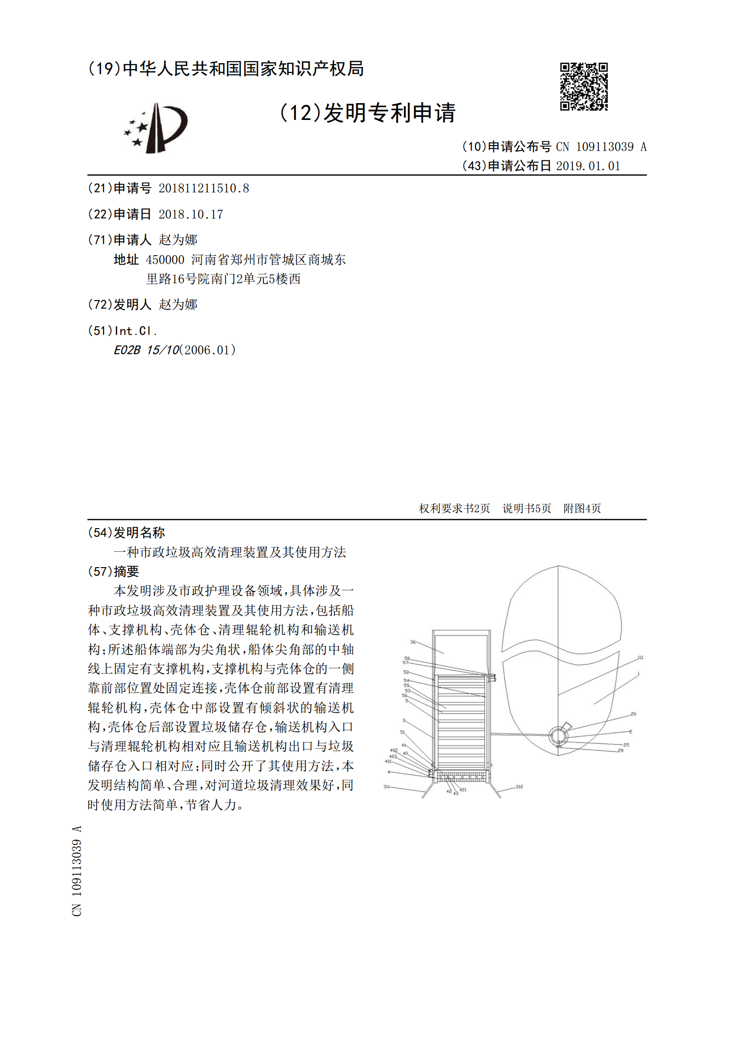 本发明涉及市政护理设备领域,具体涉及一种市政垃圾高效清理装置及其使用方法,包括船体、支撑机构、壳体仓、清理辊轮机构和输送机构;所述船体端部为尖角状,船体尖角部的中轴线上固定有支撑机构,支撑机构与壳体仓的一侧靠前部位置处固定连接,壳体仓前部设置有清理辊轮机构,壳体仓中部设置有倾斜状的输送机构,壳体仓后部设置垃圾储存仓,输送机构入口与清理辊轮机构相对应且输送机构出口与垃圾储存仓入口相对应;同时公开了其使用方法,本发明结构简单、合理,对河道垃圾清理效果好,同时使用方法简单,节省人力。