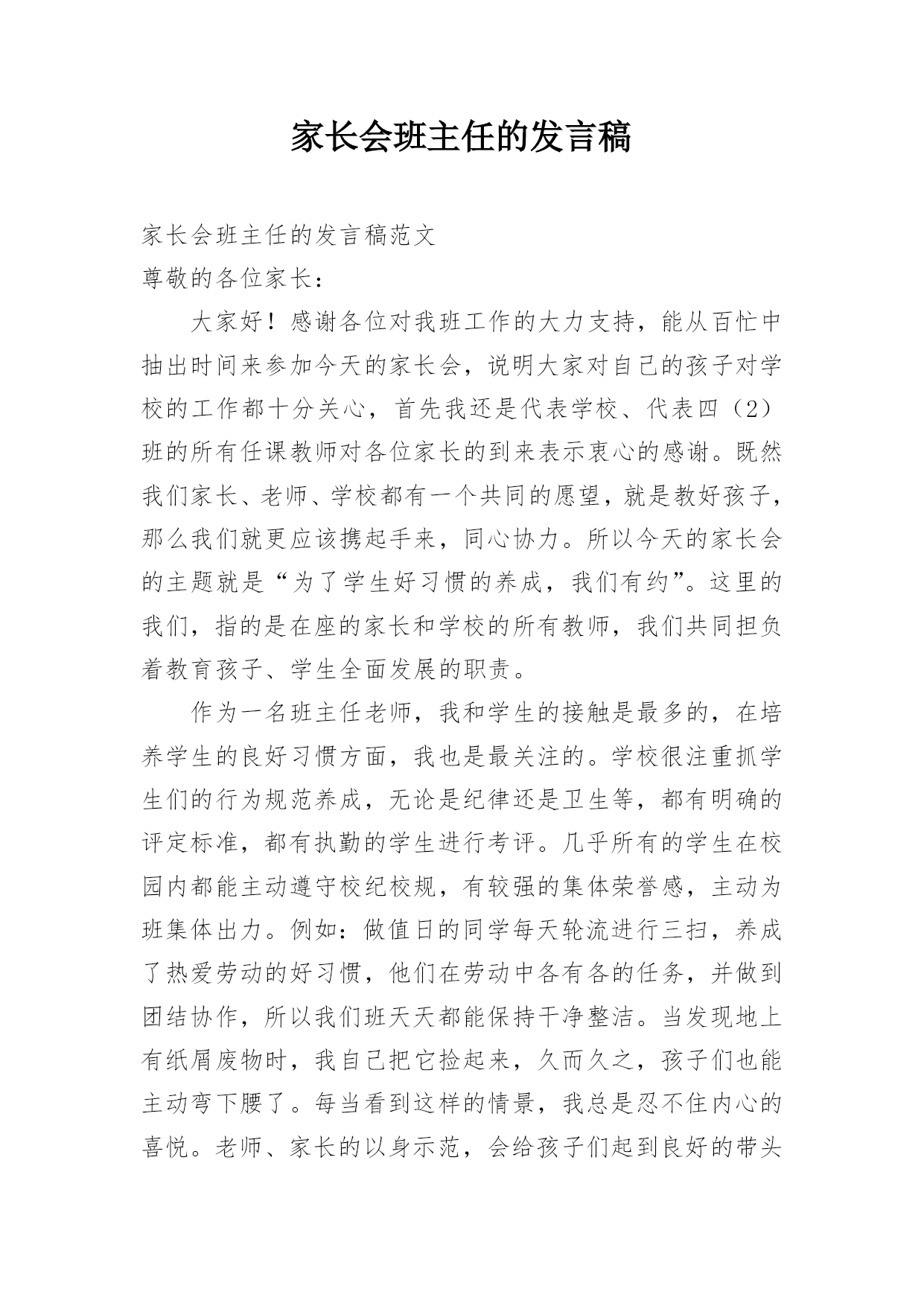 家长会班主任的发言稿家长会班主任的发言稿范文尊敬的各位家长:大家好!感谢各位对我班工作的大力支持,能从百忙中抽出时间来参加今天的家长会,说明大家对自己的孩子对学校的工作都十分关心,首先我还是代表学校、代表四(2)班的所有任课教师对各位家长的到来表示衷心的感谢。既然我们家长、老师、学校都有一个共同的愿望,就是教好孩子,那么我们就更应该携起手来,同心协力。所以今天的家长会的主题就是“为了学生好习惯的养成,我们有约”。这里的我们,指的是在座的家长和学校的所有教师,我们共同担负着教育孩子、学生全面发展的职责。作为