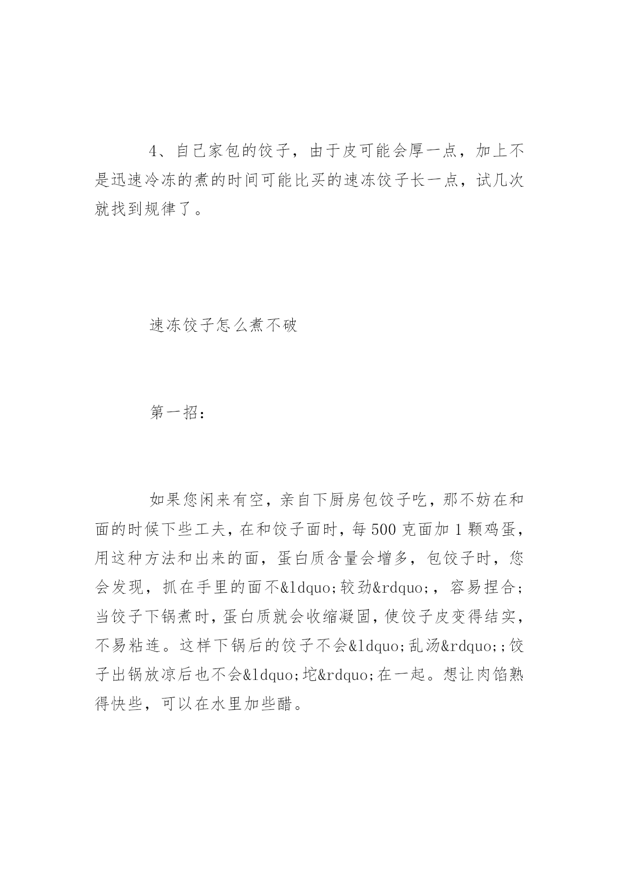 速冻饺子怎么煮好吃速冻饺子怎么煮好吃速冻水饺是将包好的饺子经过速冻以达到冷藏,可以随时食用的一种食物。饺子是受中国汉族人民喜爱的传统特色食品,是每年春节必吃的年节食品。以下是小编为大家整理的速冻饺子怎么煮好吃相关内容,仅供参考,希望能够帮助大家!篇一:煮饺子的方法吃饺子容易、煮饺子难。如何掌握火候,怎样煮饺子才不会破呢?相信您听了以下我们向您介绍的几招妙法,您的忧虑就会一扫而空。第一招:民间关于煮饺子有几句俗话:“煮饺子先煮皮,后煮馅”,“盖锅盖煮馅,敝锅盖煮皮”。这几句话是很有道理的。大家知道水的沸点是