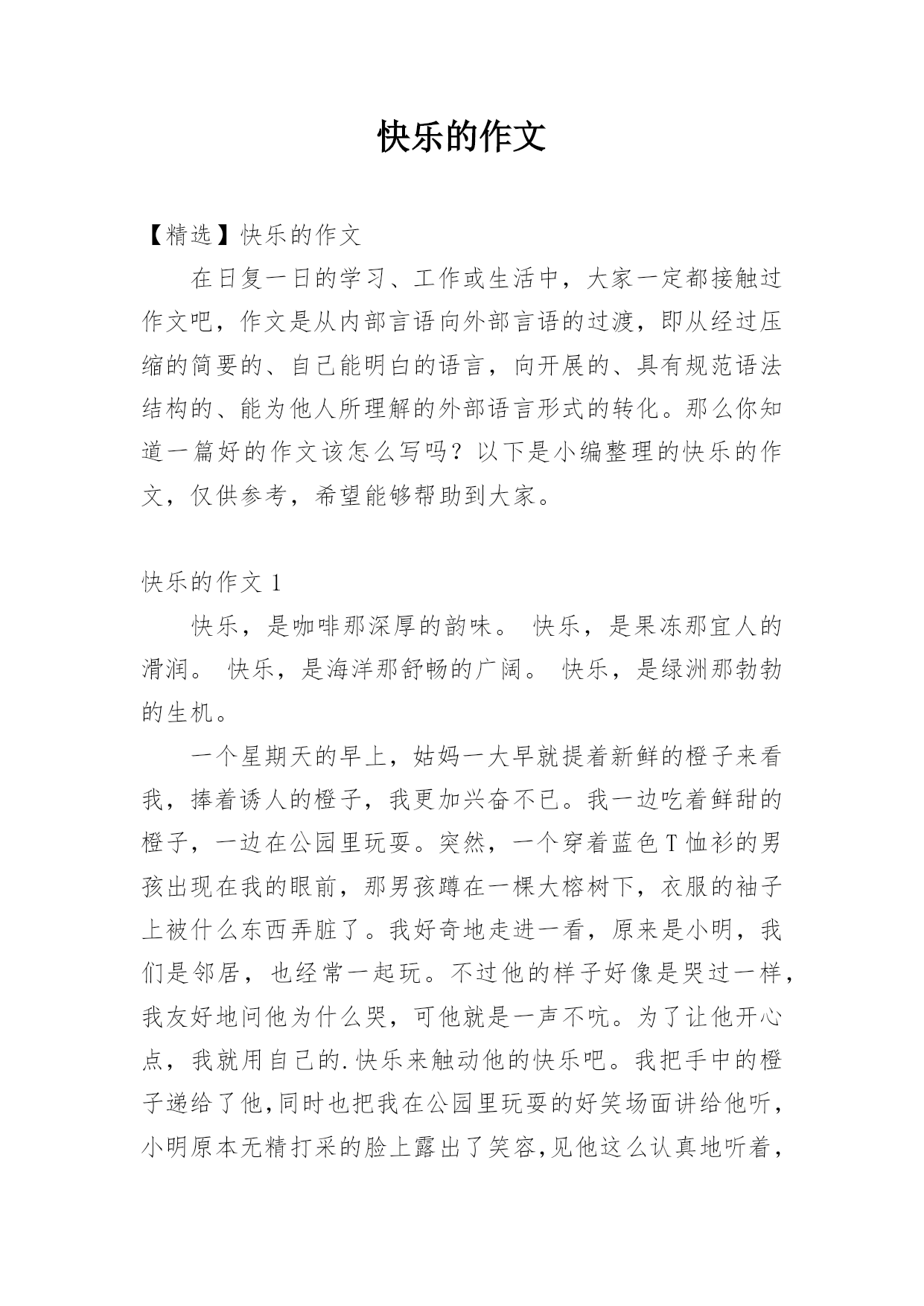 快乐的作文【精选】快乐的作文在日复一日的学习、工作或生活中,大家一定都接触过作文吧,作文是从内部言语向外部言语的过渡,即从经过压缩的简要的、自己能明白的语言,向开展的、具有规范语法结构的、能为他人所理解的外部语言形式的转化。那么你知道一篇好的作文该怎么写吗?以下是小编整理的快乐的作文,仅供参考,希望能够帮助到大家。快乐的作文1快乐,是咖啡那深厚的韵味。快乐,是果冻那宜人的滑润。快乐,是海洋那舒畅的广阔。快乐,是绿洲那勃勃的生机。一个星期天的早上,姑妈一大早就提着新鲜的橙子来看我,捧着诱人的橙子,我更加兴奋