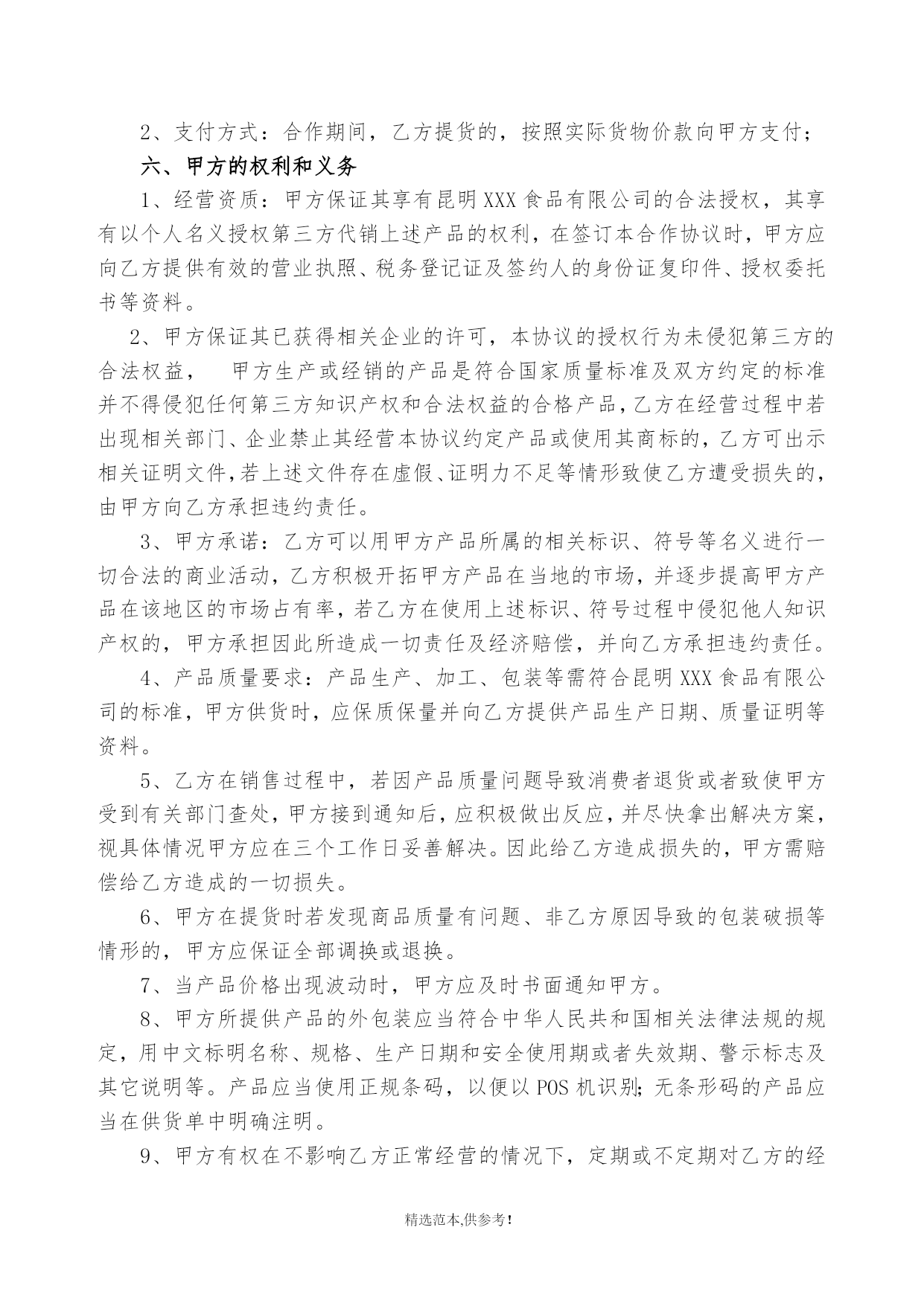 精选范本,供参考!精选范本,供参考!精选范本,供参考!XXX食品销售合作协议书授权方(甲方):销售方(乙方):根据《中华人民共和国合同法》等有关法律法规,经甲、乙双方共同友好协商,本着自愿、平等、互惠互利、诚实信用的原则,现就甲方授权乙方销售XXX食品相关事宜,订立如下合同条款,以资双方共同遵守执行。一、代理区域乙方的代理销售地点为:昭通市彝良县,甲方确保乙方为该区域唯一指定供货方,若甲方违反上述条款,乙方有权立即终止本合同及得到相应赔偿。二、代理产品乙方销售甲方的产品为:昆明XXX食品有限公司相关的系列