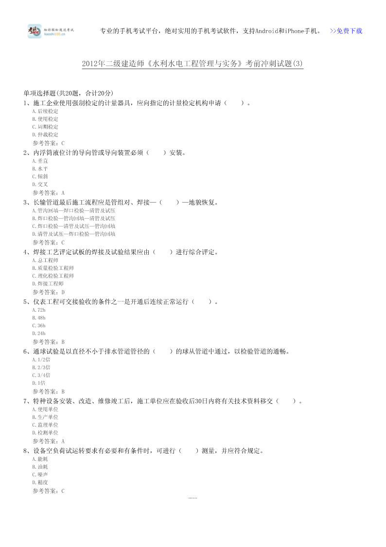 专业的手机考试平台,绝对实用的手机考试软件,支持Android和iPhone手机。>>免费下载2012年二级建造师《水利水电工程管理与实务》考前冲刺试题(3)单项选择题(共20题,合计20分)1、施工企业使用强制检定的计量器具,应向指定的计量检定机构申请()。A.后续检定B.使用检定C.周期检定D.仲裁检定参考答案:C2、内浮筒液位计的导向管或导向装置必须()安装。A.垂直B.水平C.倾斜D.交叉参考答案:A3、长输管道最后施工流程应是管组对、焊接—()—地貌恢复。A.管沟回填—焊口检验—清管及试压B.焊