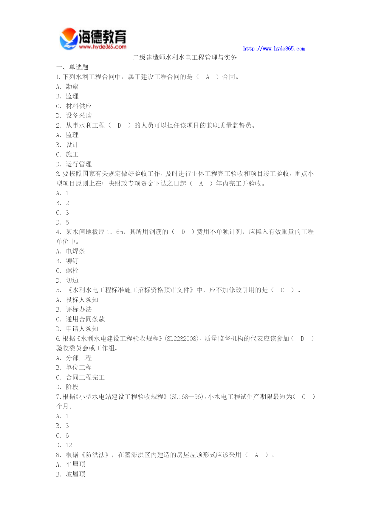 http://www.hyde365.com二级建造师水利水电工程管理与实务单选题1.下列水利工程合同中,属于建设工程合同的是(A)合同。A.勘察B.监理C.材料供应D.设备采购2.从事水利工程(D)的人员可以担任该项目的兼职质量监督员。A.监理B.设计C.施工D.运行管理3.要按照国家有关规定做好验收工作,及时进行主体工程完工验收和项目竣工验收,重点小型项目原则上在中央财政专项资金下达之日起(A)年内完工并验收。A.1B.2C.3D.54.某水闸地板厚1.6m,其所用钢筋的(D)费用不单独计列,应摊入有