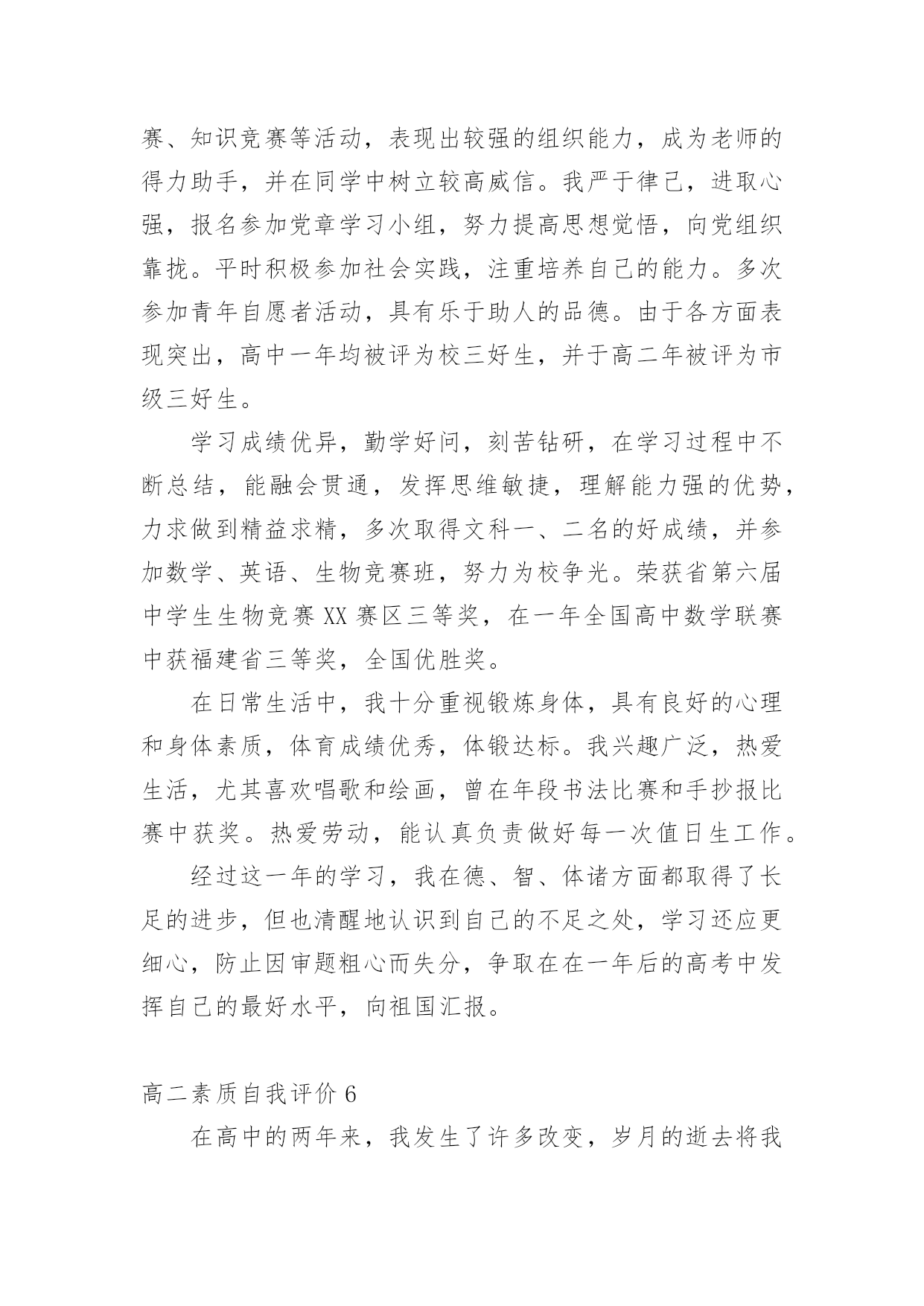 高二素质自我评价高二素质自我评价在学习、工作乃至生活中,我们会经常用到自我评价,自我评价直接影响学习和参与社会活动的积极性,也影响着与他人的交往关系。那么你有了解过自我评价吗?以下是小编为大家收集的高二素质自我评价,仅供参考,大家一起来看看吧。高二素质自我评价1本人在校热爱祖国,尊敬师长,团结同学,乐于助人,是老师的好帮手,同学的好朋友。我学习勤奋,积极向上,喜欢和同学讨论并解决问题,经常参加班级学校组织的各种课内外活动。在校期间,我能自觉遵守中学生守则,遵守学校纪律认真做好分内之事,我所在宿舍多次被学校