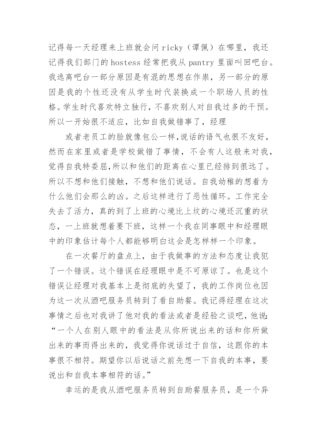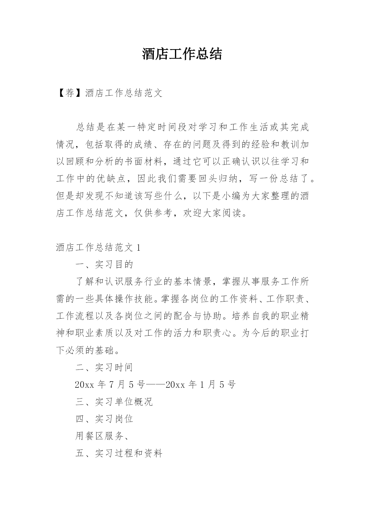 酒店工作总结【荐】酒店工作总结范文总结是在某一特定时间段对学习和工作生活或其完成情况,包括取得的成绩、存在的问题及得到的经验和教训加以回顾和分析的书面材料,通过它可以正确认识以往学习和工作中的优缺点,因此我们需要回头归纳,写一份总结了。但是却发现不知道该写些什么,以下是小编为大家整理的酒店工作总结范文,仅供参考,欢迎大家阅读。酒店工作总结范文1一、实习目的了解和认识服务行业的基本情景,掌握从事服务工作所需的一些具体操作技能。掌握各岗位的工作资料、工作职责、工作流程以及各岗位之间的配合与协助。培养自我的职业