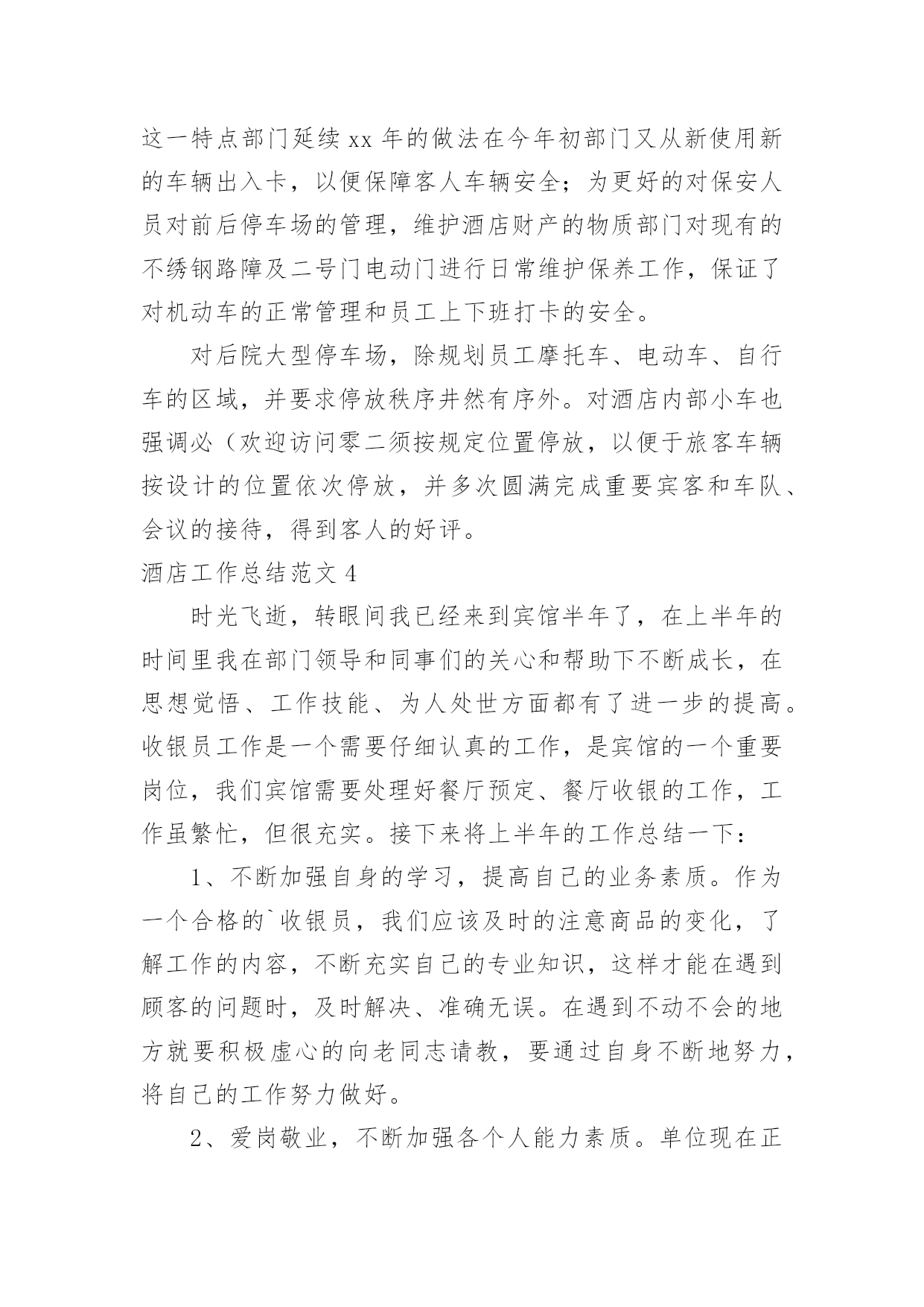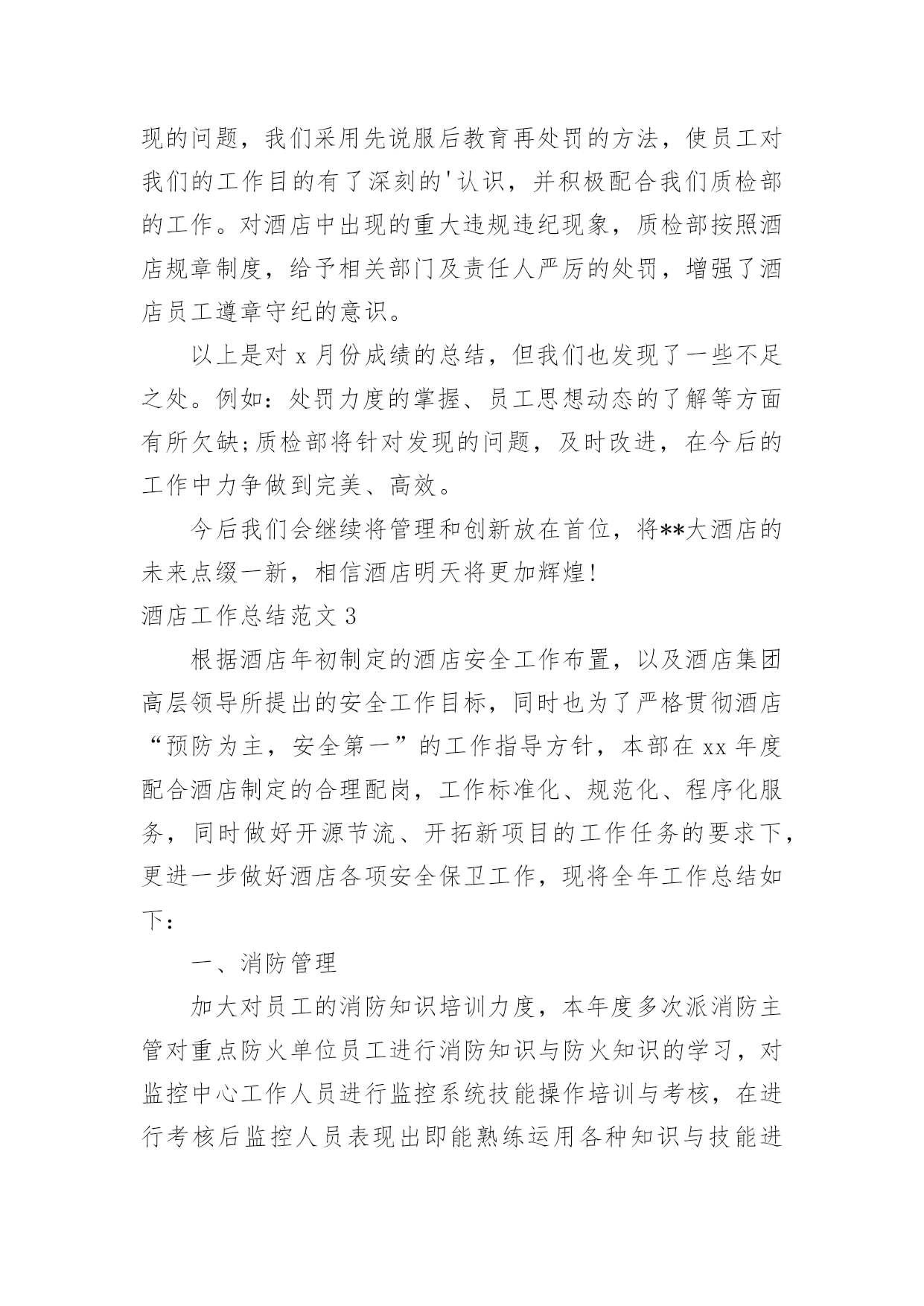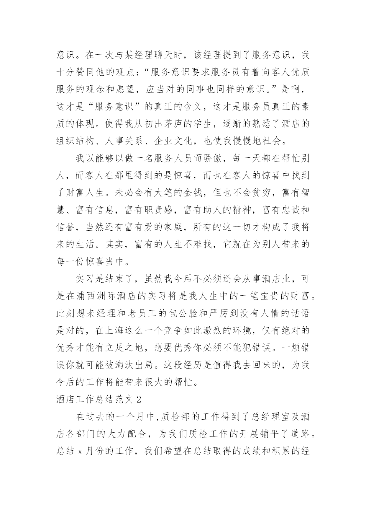 酒店工作总结(热门)酒店工作总结总结是在一段时间内对学习和工作生活等表现加以总结和概括的一种书面材料,他能够提升我们的书面表达能力,因此我们需要回头归纳,写一份总结了。总结怎么写才不会千篇一律呢?以下是小编为大家收集的酒店工作总结,仅供参考,大家一起来看看吧。酒店工作总结篇1xx年是总公司寻求改革的一年,也是总公司快速进展的一年。这一年来,物管中心依据总公司年初提出的“质量、改革、进展”的工作目标要求,在总公司领导的关怀下,全体员工团结一心,艰苦奋斗,扎实工作,不断创新,进一步提升了物管中心的管理和服务质