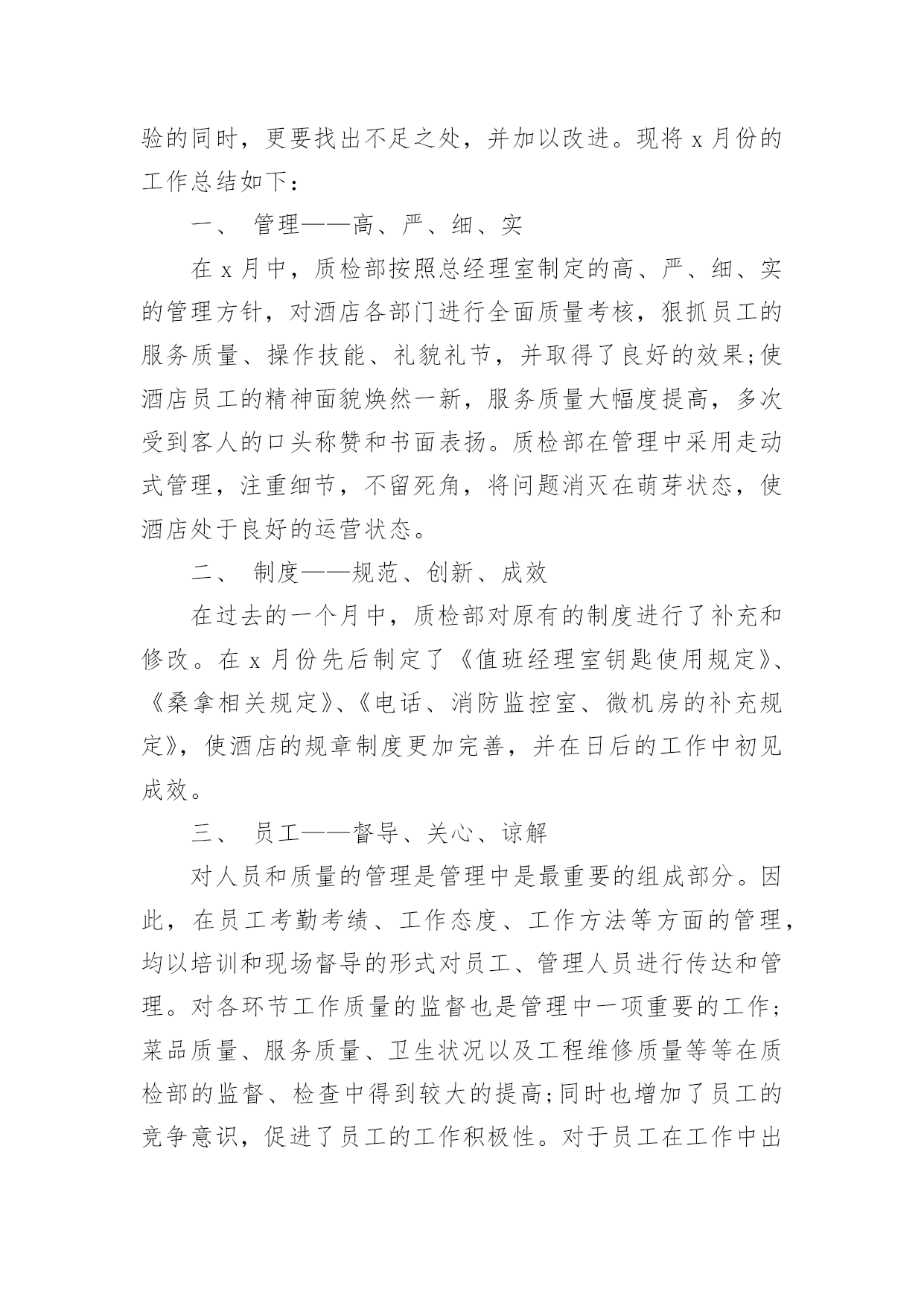酒店工作总结酒店工作总结锦集[12篇]总结就是对一个时期的学习、工作或其完成情况进行一次全面系统的回顾和分析的书面材料,它能帮我们理顺知识结构,突出重点,突破难点,因此十分有必须要写一份总结哦。那么总结应该包括什么内容呢?下面是小编收集整理的酒店工作总结,希望对大家有所帮助。酒店工作总结篇1在过去的一个月中,质检部的工作得到了总经理室及酒店各部门的大力配合,为我们质检工作的开展铺平了道路。总结—月份的工作,我们希望在总结取得的成绩和积累的经验的同时,更要找出不足之处,并加以改进。现将—月份的工作总结如下: